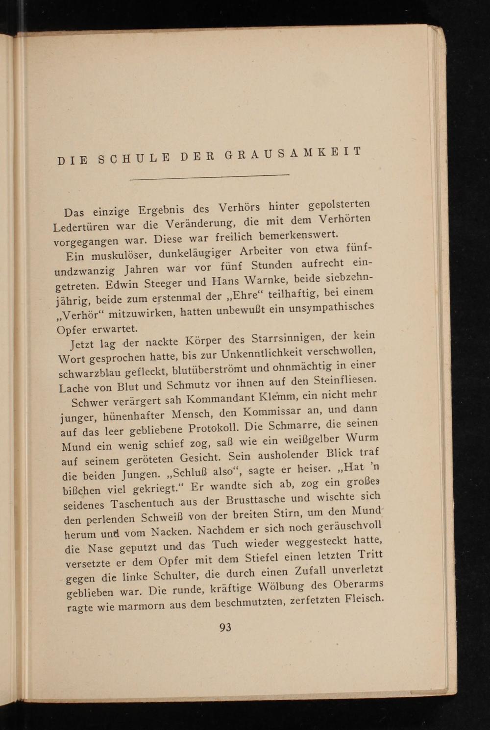 Schwer verärgert sah Kommandant Klemm, ein nicht mehr junger, hünenhafter Mensch, den Kommissar an, und dann auf das leer gebliebene Protokoll. Die Schmarre, die seinen Mund ein wenig schief zog, saß wie ein weißgelber Wurm auf seinem geröteten Gesicht. Sein ausholender Blick traf die beiden Jungen. ,, Schluß also", sagte er heiser. ,, Hat' n bißchen viel gekriegt." Er wandte sich ab, zog ein großes seidenes Taschentuch aus der Brusttasche und wischte sich den perlenden Schweiß von der breiten Stirn, um den Mund herum und vom Nacken. Nachdem er sich noch geräuschvoll die Nase geputzt und das Tuch wieder weggesteckt hatte, versetzte er dem Opfer mit dem Stiefel einen letzten Tritt gegen die linke Schulter, die durch einen Zufall unverletzt geblieben war. Die runde, kräftige Wölbung des Oberarms ragte wie marmorn aus dem beschmutzten, zerfetzten Fleisch.