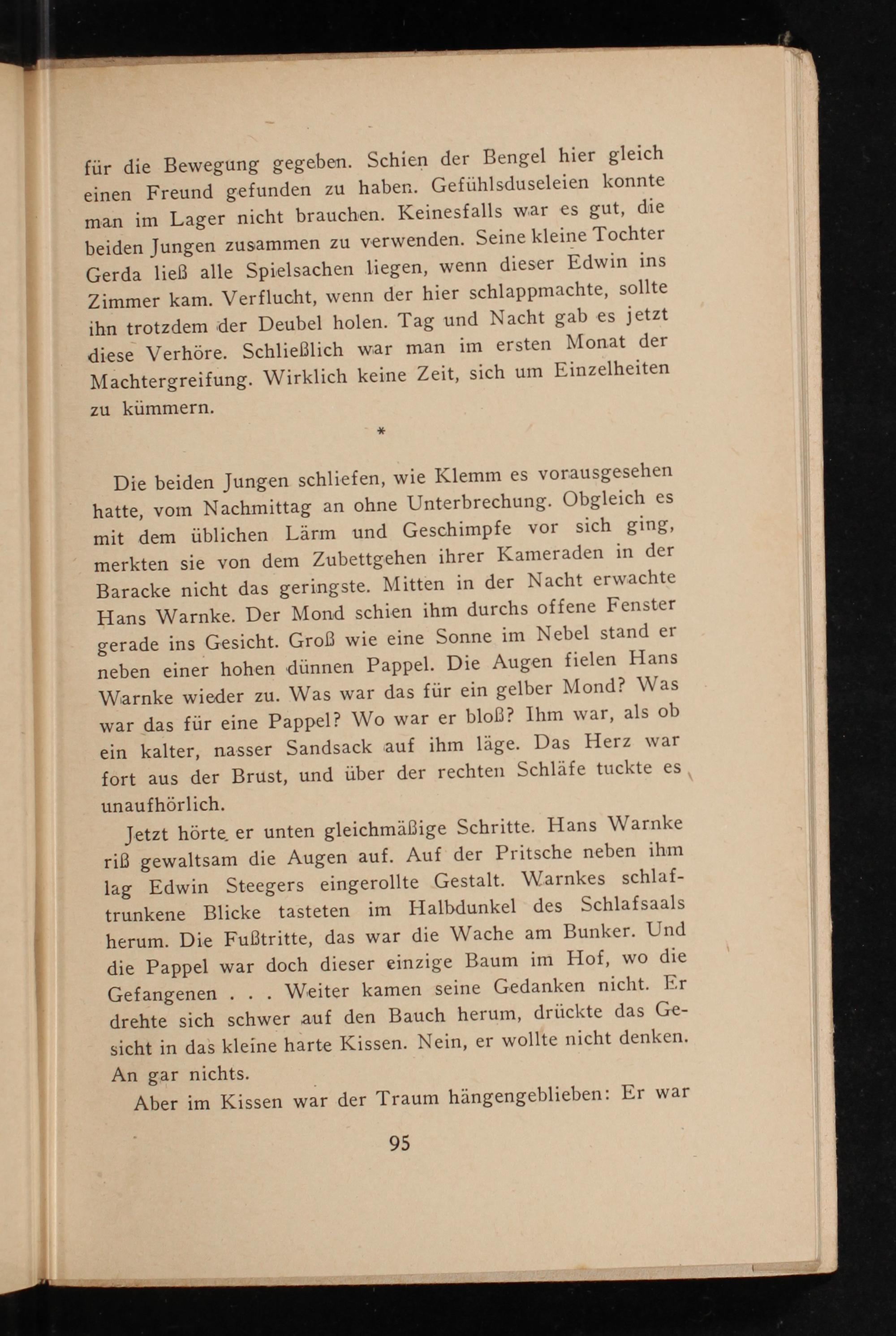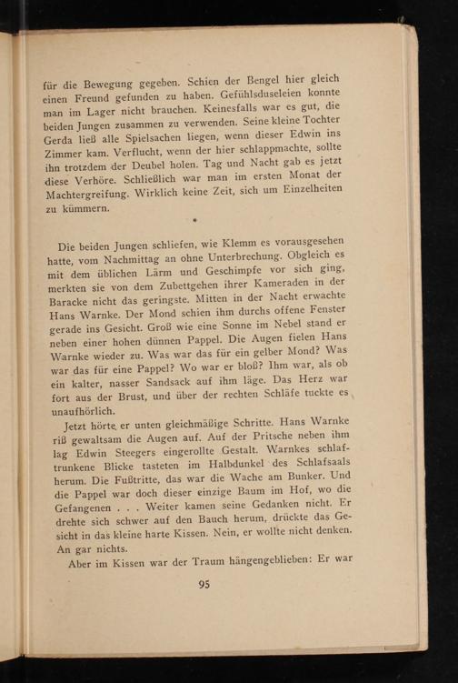 Die beiden Jungen schliefen, wie Klemm es vorausgesehen hatte, vom Nachmittag an ohne Unterbrechung. Obgleich es mit dem üblichen Lärm und Geschimpfe vor sich ging, merkten sie von dem Zubettgehen ihrer Kameraden in der Baracke nicht das geringste. Mitten in der Nacht erwachte Hans Warnke . Der Mond schien ihm durchs offene Fenster gerade ins Gesicht. Groß wie eine Sonne im Nebel stand er neben einer hohen dünnen Pappel. Die Augen fielen Hans Warnke wieder zu. Was war das für ein gelber Mond? Was war das für eine Pappel? Wo war er bloß? Ihm war, als ob ein kalter, nasser Sandsack auf ihm läge. Das Herz war fort aus der Brust, und über der rechten Schläfe tuckte es unaufhörlich.