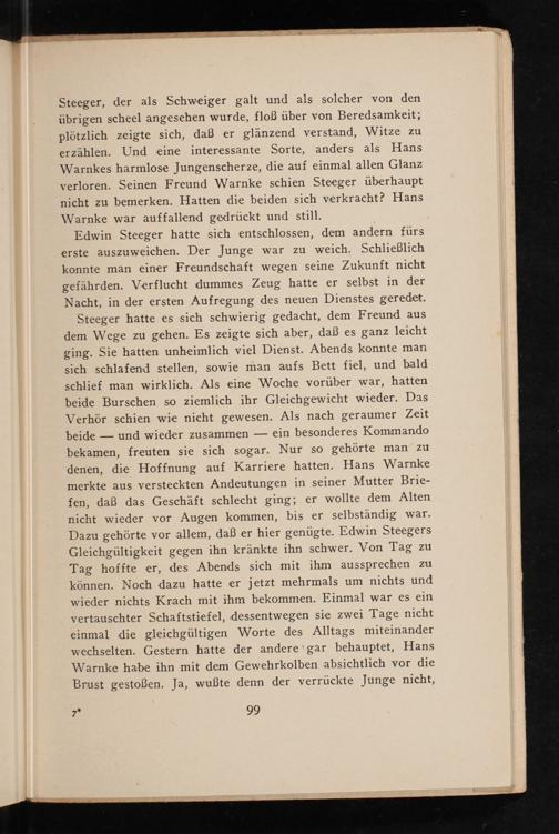 Steeger hatte es sich schwierig gedacht, dem Freund aus dem Wege zu gehen. Es zeigte sich aber, daß es ganz leicht ging. Sie hatten unheimlich viel Dienst. Abends konnte man sich schlafend stellen, sowie man aufs Bett fiel, und bald schlief man wirklich. Als eine Woche vorüber war, hatten beide Burschen so ziemlich ihr Gleichgewicht wieder. Das Verhör schien wie nicht gewesen. Als nach geraumer Zeit beide und wieder zusammen ein besonderes Kommando bekamen, freuten sie sich sogar. Nur so gehörte man zu denen, die Hoffnung auf Karriere hatten. Hans Warnke merkte aus versteckten Andeutungen in seiner Mutter Briefen, daß das Geschäft schlecht ging; er wollte dem Alten nicht wieder vor Augen kommen, bis er selbständig war. Dazu gehörte vor allem, daß er hier genügte. Edwin Steegers Gleichgültigkeit gegen ihn kränkte ihn schwer. Von Tag zu Tag hoffte er, des Abends sich mit ihm aussprechen zu können. Noch dazu hatte er jetzt mehrmals um nichts und wieder nichts Krach mit ihm bekommen. Einmal war es ein vertauschter Schaftstiefel, dessentwegen sie zwei Tage nicht einmal die gleichgültigen Worte des Alltags miteinander wechselten. Gestern hatte der andere gar behauptet, Hans Warnke habe ihn mit dem Gewehrkolben absichtlich vor die Brust gestoßen. Ja, wußte denn der verrückte Junge nicht,