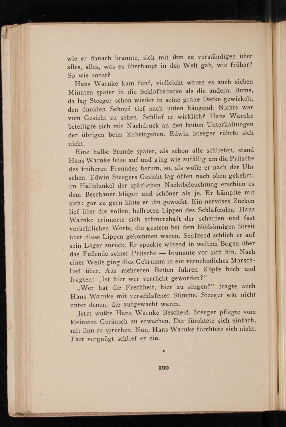 Hans Warnke kam fünf, vielleicht waren es auch sieben Minuten später in die Schlafbaracke als die andern. Bums, da lag Steeger schon wieder in seine graue Decke gewickelt, den dunklen Schopf tief nach unten hängend. Nichts war vom Gesicht zu sehen. Schlief er wirklich? Hans Warnke beteiligte sich mit Nachdruck an den lauten Unterhaltungen der übrigen beim Zubettgehen. Edwin Steeger rührte sich nicht.