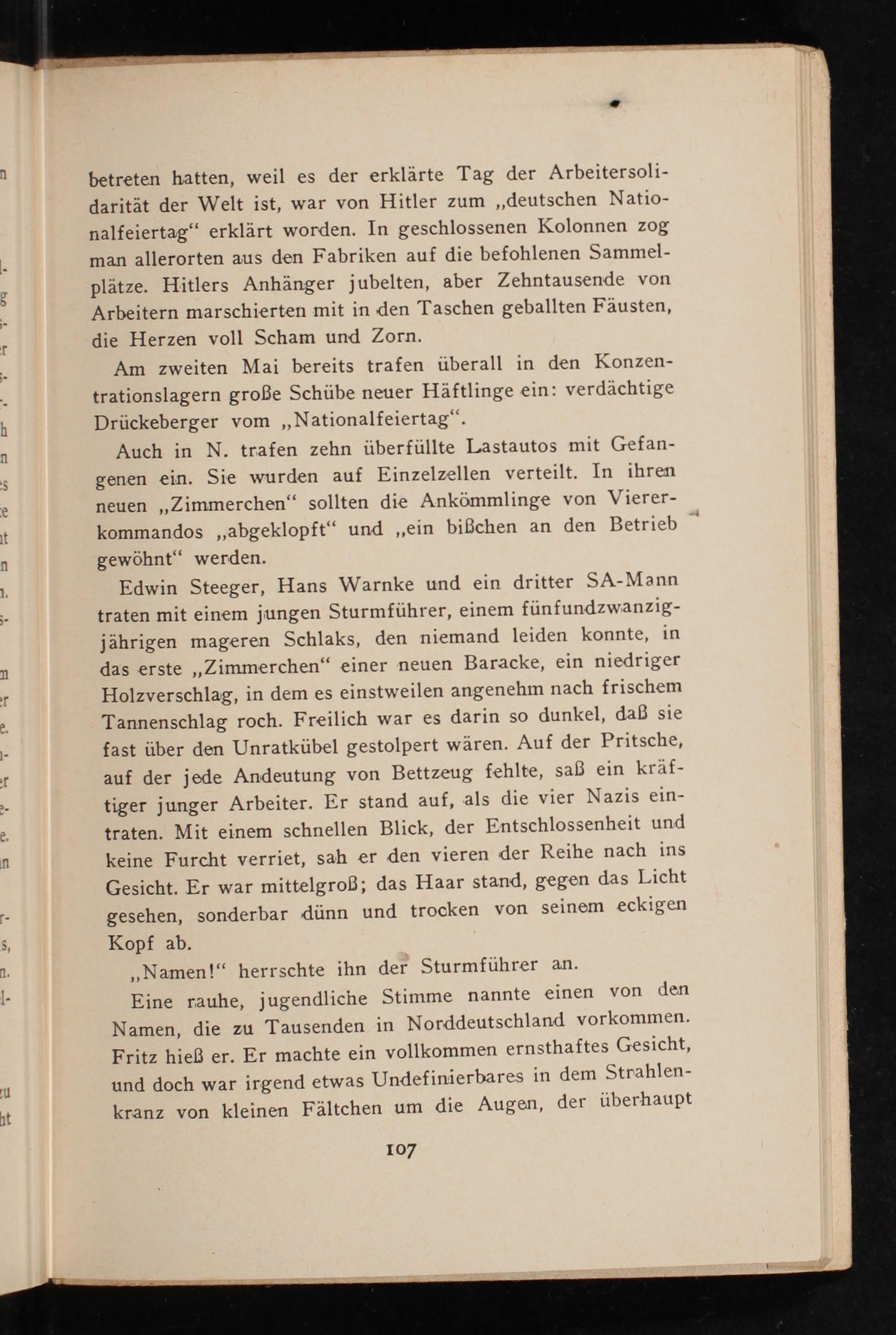 Edwin Steeger, Hans Warnke und ein dritter SA-Mann traten mit einem jungen Sturmführer, einem fünfundzwanzig- jährigen mageren Schlaks, den niemand leiden konnte, in das erste„Zimmerchen“ einer neuen Baracke, ein niedriger Holzverschlag, in dem es einstweilen angenehm nach frischem Tannenschlag roch. Freilich war es darin so dunkel, daß sie fast über den Unratkübel gestolpert wären. Auf der Pritsche, auf der jede Andeutung von Bettzeug fehlte, saß ein kräf- tiger junger Arbeiter. Er stand auf, als die vier Nazis ein- traten. Mit einem schnellen Blick, der Entschlossenheit und keine Furcht verriet, sah er den vieren der Reihe nach ins Gesicht. Er war mittelgroß; das Haar stand, gegen das Licht gesehen, sonderbar dünn und trocken von seinem eckigen Kopf ab.