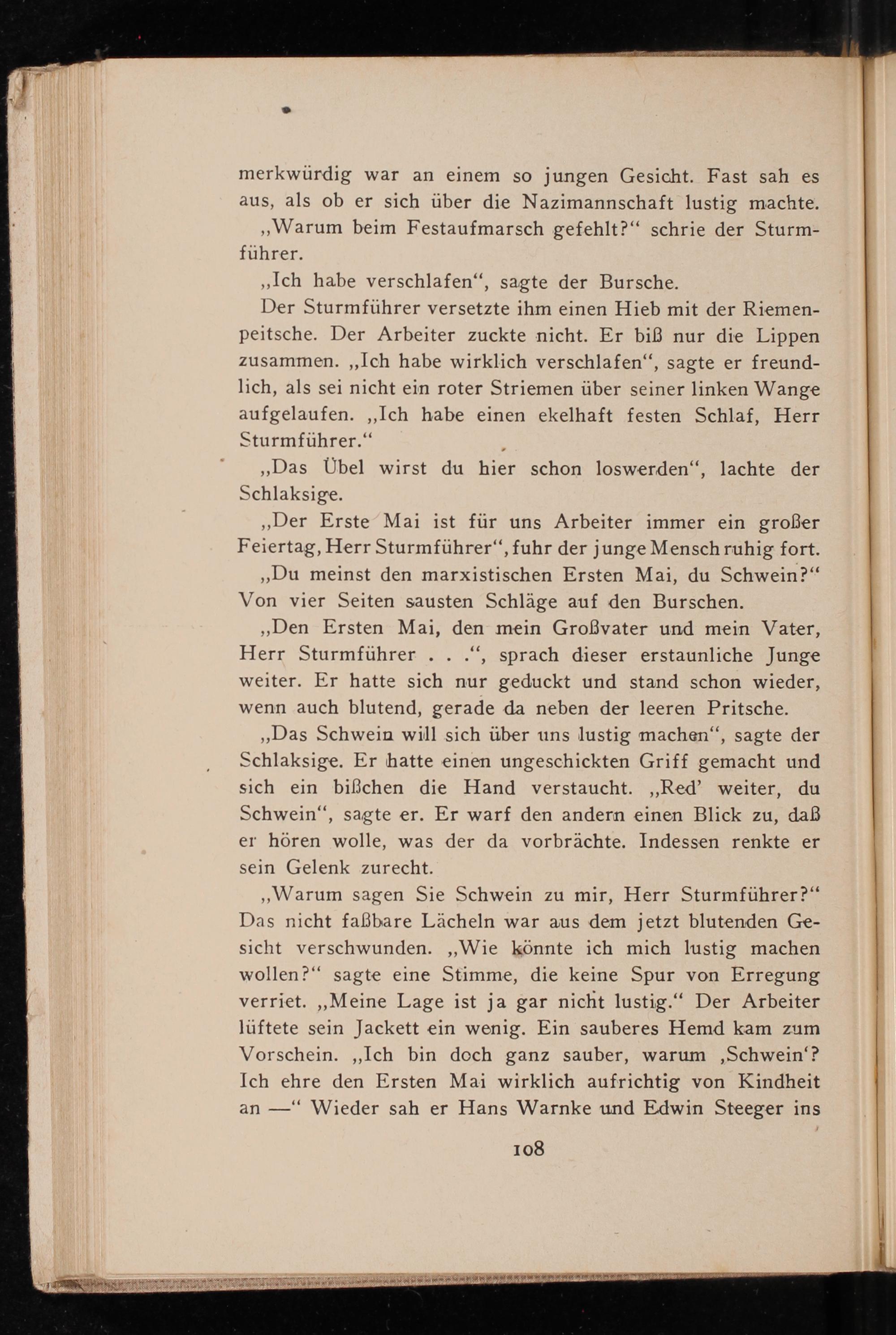 „Warum sagen Sie Schwein zu mir, Herr Sturmführer?“ Das nicht faßbare Lächeln war aus dem jetzt blutenden Ge- sicht verschwunden.„Wie könnte ich mich lustig machen wollen?“ sagte eine Stimme, die keine Spur von Erregung verriet.„Meine Lage ist ja gar nicht lustig.“ Der Arbeiter lüftete sein Jackett ein wenig. Ein sauberes Hemd kam zum Vorschein.„Ich bin doch ganz sauber, warum ‚Schwein‘? Ich ehre den Ersten Mai wirklich aufrichtig von Kindheit an—‘ Wieder sah er Hans Warnke und Edwin Steeger ins