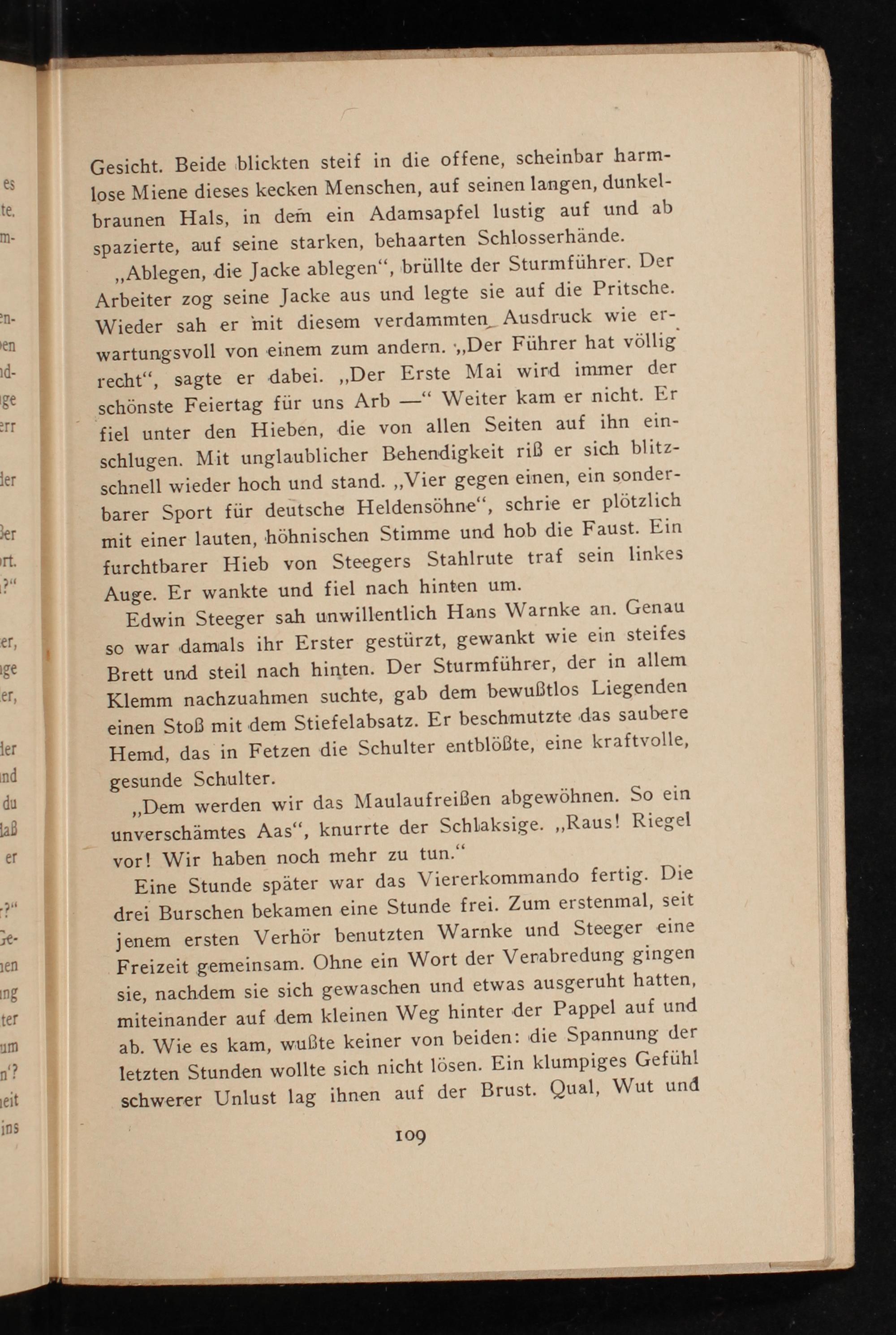 ,, Ablegen, die Jacke ablegen", brüllte der Sturmführer. Der Arbeiter zog seine Jacke aus und legte sie auf die Pritsche. Wieder sah er mit diesem verdammten Ausdruck wie erwartungsvoll von einem zum andern. ,, Der Führer hat völlig recht", sagte er dabei. ,, Der Erste Mai wird immer der schönste Feiertag für uns Arb" Weiter kam er nicht. Er fiel unter den Hieben, die von allen Seiten auf ihn einschlugen. Mit unglaublicher Behendigkeit riß er sich blitzschnell wieder hoch und stand. ,, Vier gegen einen, ein sonderbarer Sport für deutsche Heldensöhne", schrie er plötzlich mit einer lauten, höhnischen Stimme und hob die Faust. Ein furchtbarer Hieb von Steegers Stahlrute traf sein linkes Auge. Er wankte und fiel nach hinten um.