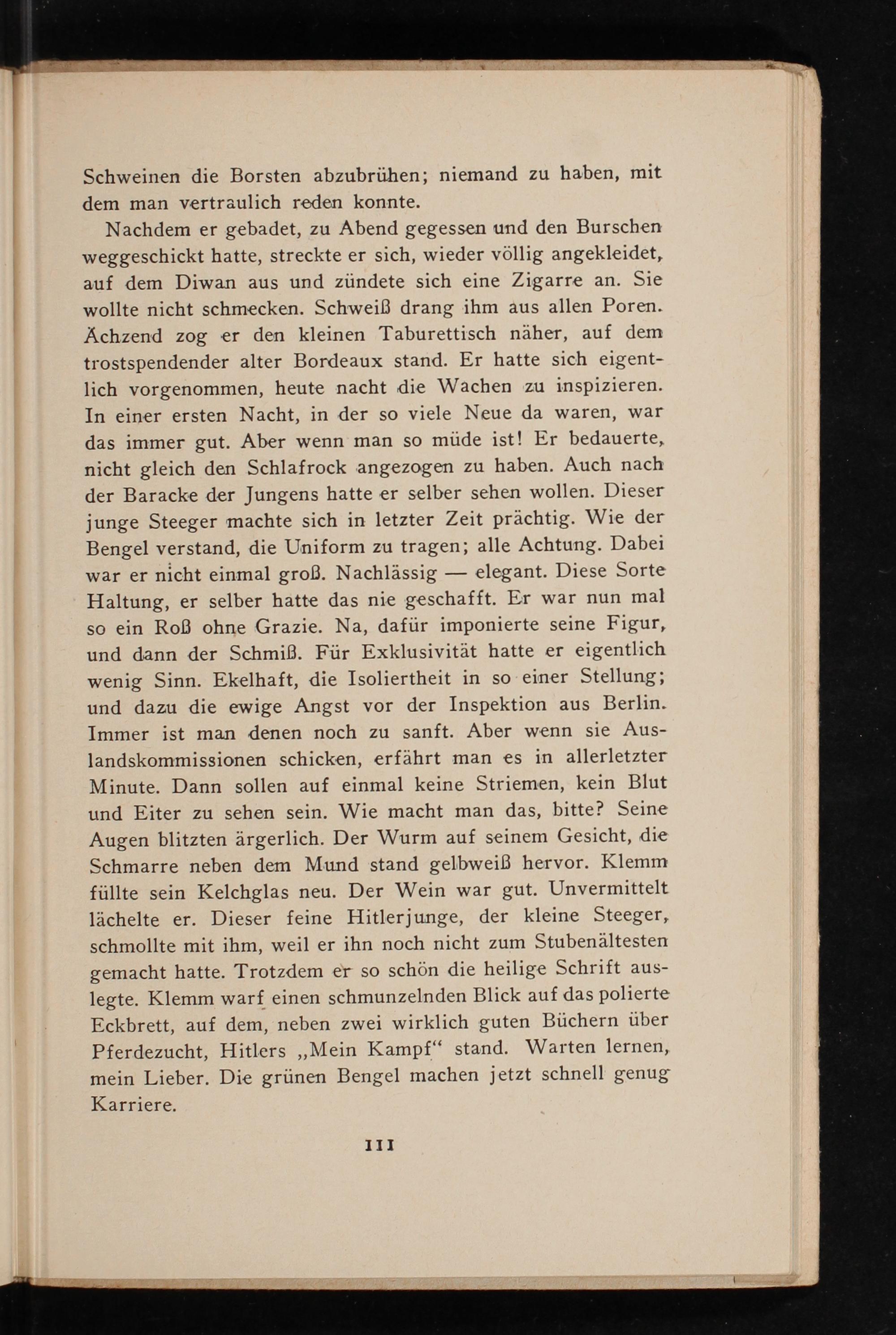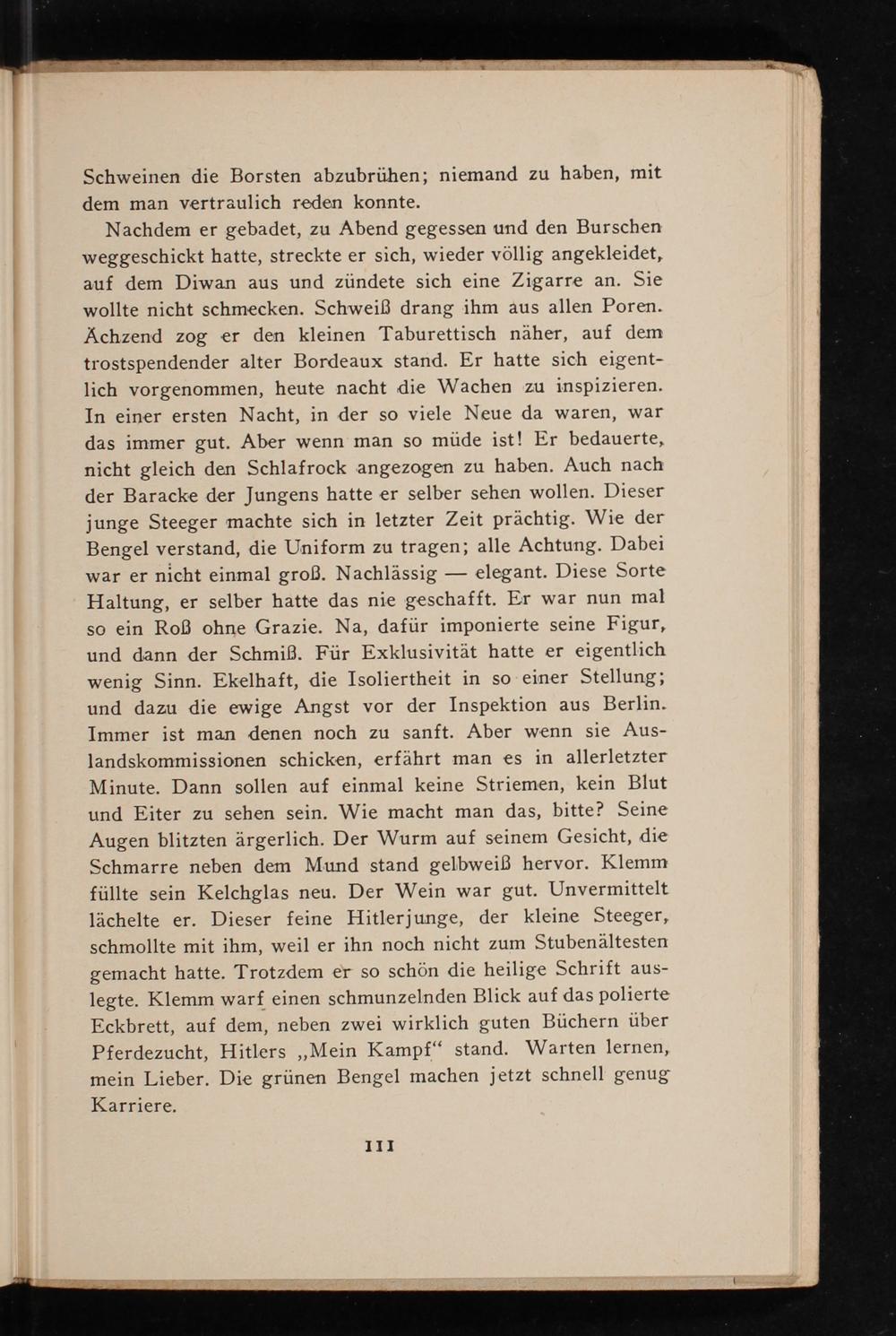 Nachdem er gebadet, zu Abend gegessen und den Burschen weggeschickt hatte, streckte er sich, wieder völlig angekleidet, auf dem Diwan aus und zündete sich eine Zigarre an. Sie wollte nicht schmecken. Schweiß drang ihm aus allen Poren. Ächzend zog er den kleinen Taburettisch näher, auf dem trostspendender alter Bordeaux stand. Er hatte sich eigent- lich vorgenommen, heute nacht die Wachen zu inspizieren. In einer ersten Nacht, in der so viele Neue da waren, war das immer gut. Aber wenn man so müde ist! Er bedauerte, nicht gleich den Schlafrock angezogen zu haben. Auch nach der Baracke der Jungens hatte er selber sehen wollen. Dieser junge Steeger machte sich in letzter Zeit prächtig. Wie der Bengel verstand, die Uniform zu tragen; alle Achtung. Dabei war er nicht einmal groß. Nachlässig— elegant. Diese Sorte Haltung, er selber hatte das nie geschafft. Er war nun mal so ein Roß ohne Grazie. Na, dafür imponierte seine Figur, und dann der Schmiß. Für Exklusivität hatte er eigentlich wenig Sinn. Ekelhaft, die Isoliertheit in so einer Stellung; und dazu die ewige Angst vor der Inspektion aus Berlin . Immer ist man denen noch zu sanft. Aber wenn sie Aus- landskommissionen schicken, erfährt man es in allerletzter Minute. Dann sollen auf einmal keine Striemen, kein Blut und Eiter zu sehen sein. Wie macht man das, bitte? Seine Augen blitzten ärgerlich. Der Wurm auf seinem Gesicht, die Schmarre neben dem Mund stand gelbweiß hervor. Klemm füllte sein Kelchglas neu. Der Wein war gut. Unvermittelt lächelte er. Dieser feine Hitlerjunge, der kleine Steeger, schmollte mit ihm, weil er ihn noch nicht zum Stubenältesten gemacht hatte. Trotzdem er so schön die heilige Schrift aus- legte. Klemm warf einen schmunzelnden Blick auf das polierte Eckbrett, auf dem, neben zwei wirklich guten Büchern über Pferdezucht, Hitlers„Mein Kampf “ stand. Warten lernen, mein Lieber. Die grünen Bengel machen jetzt schnell genug Karriere.