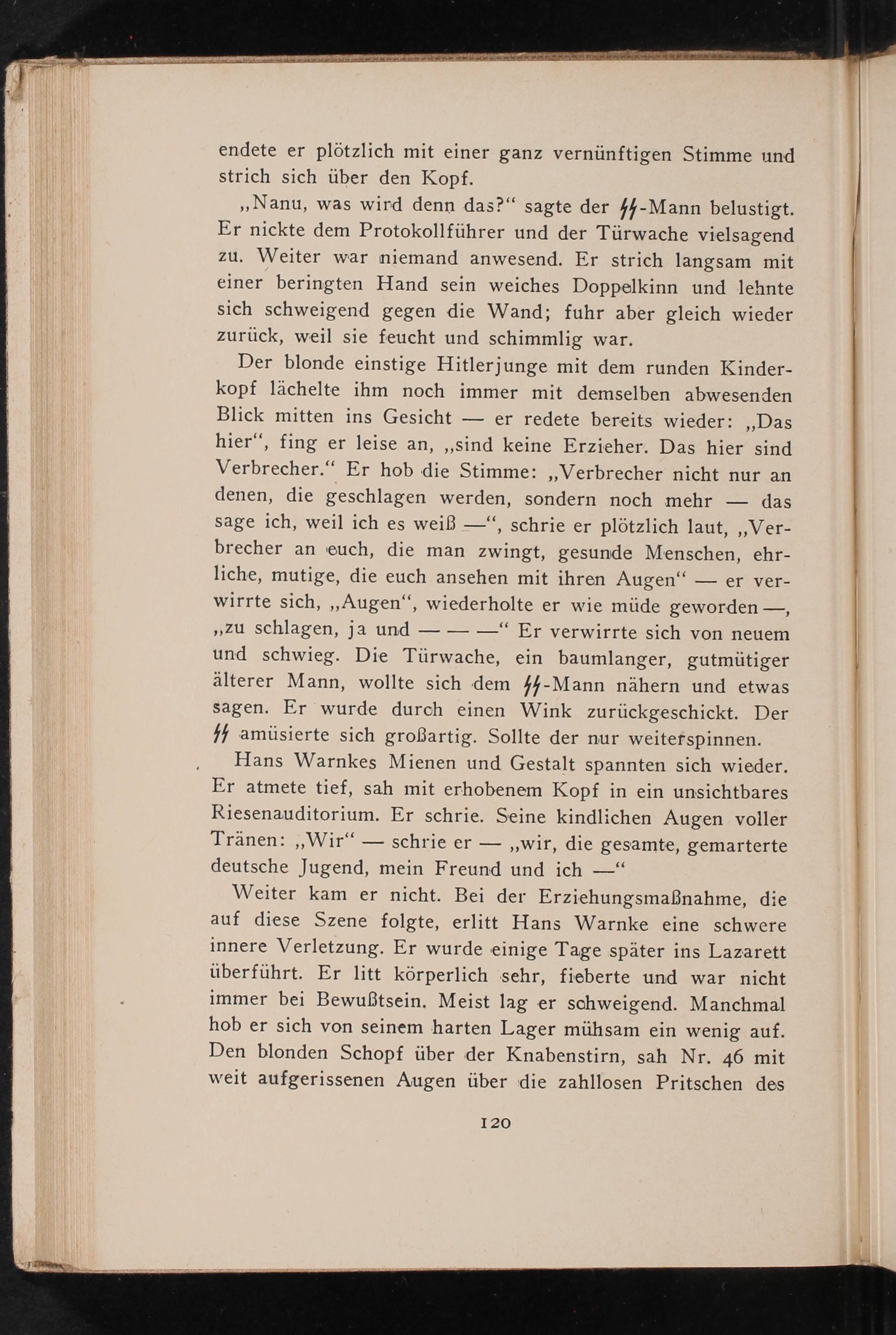 Weiter kam er nicht. Bei der Erziehungsmaßnahme, die auf diese Szene folgte, erlitt Hans Warnke eine schwere innere Verletzung. Er wurde einige Tage später ins Lazarett überführt. Er litt körperlich sehr, fieberte und war nicht immer bei Bewußtsein. Meist lag er schweigend. Manchmal hob er sich von seinem harten Lager mühsam ein wenig auf. Den blonden Schopf über der Knabenstirn, sah Nr. 46 mit weit aufgerissenen Augen über die zahllosen Pritschen des