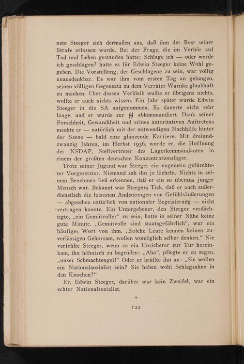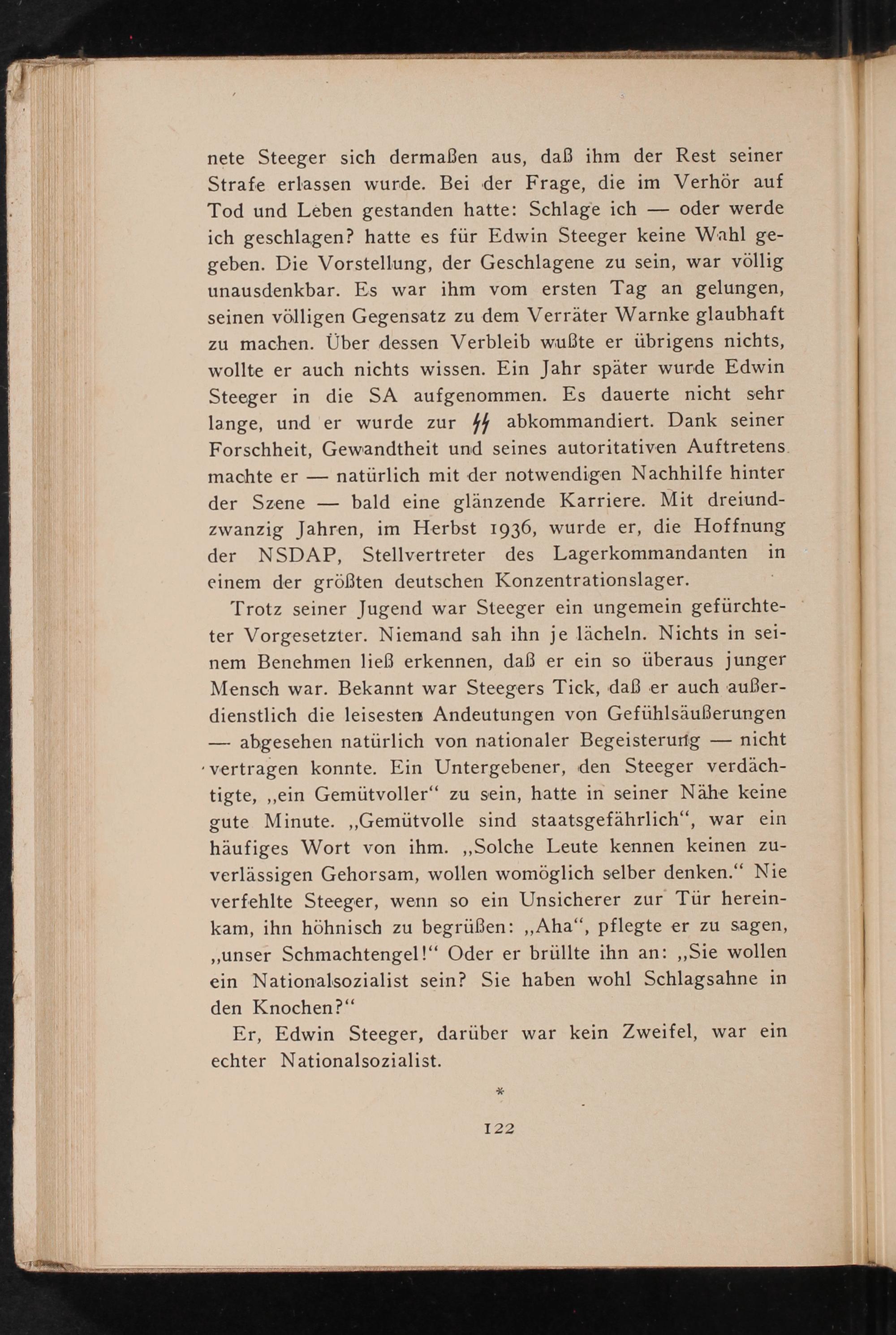 nete Steeger sich dermaßen aus, daß ihm der Rest seiner Strafe erlassen wurde. Bei der Frage, die im Verhör auf Tod und Leben gestanden hatte: Schlage ich oder werde ich geschlagen? hatte es für Edwin Steeger keine Wahl gegeben. Die Vorstellung, der Geschlagene zu sein, war völlig unausdenkbar. Es war ihm vom ersten Tag an gelungen, seinen völligen Gegensatz zu dem Verräter Warnke glaubhaft zu machen. Über dessen Verbleib wußte er übrigens nichts, wollte er auch nichts wissen. Ein Jahr später wurde Edwin Steeger in die SA aufgenommen. Es dauerte nicht sehr lange, und er wurde zur 44 abkommandiert. Dank seiner Forschheit, Gewandtheit und seines autoritativen Auftretens. machte er natürlich mit der notwendigen Nachhilfe hinter der Szene bald eine glänzende Karriere. Mit dreiundzwanzig Jahren, im Herbst 1936, wurde er, die Hoffnung der NSDAP , Stellvertreter des Lagerkommandanten in einem der größten deutschen Konzentrationslager.