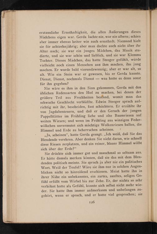 erstaunliche Ernsthaftigkeit, die allen Äußerungen dieses Mädchens eigen war. Gerda lachte nie, war nie albern; schien aber immer ebenso heiter wie auch ernsthaft. Niemand hielt sie für achtzehnjährig; aber man dachte auch nicht über ihr Alter nach; sie war ein junges Mädchen, das Musik studierte, und sie war schön und lieblich, und sie war Klemms Tochter. Dieses Mädchen, das hatte Steeger gefühlt, würde vielleicht noch einen Menschen aus ihm machen, ihn jung machen. Er wurde bald vierundzwanzig; aber er war alt, so alt. Wie ein Stein war er gewesen, bis er Gerda kannte. Dienst, Dienst, nochmals Dienst was hatte es denn sonst für ihn gegeben?