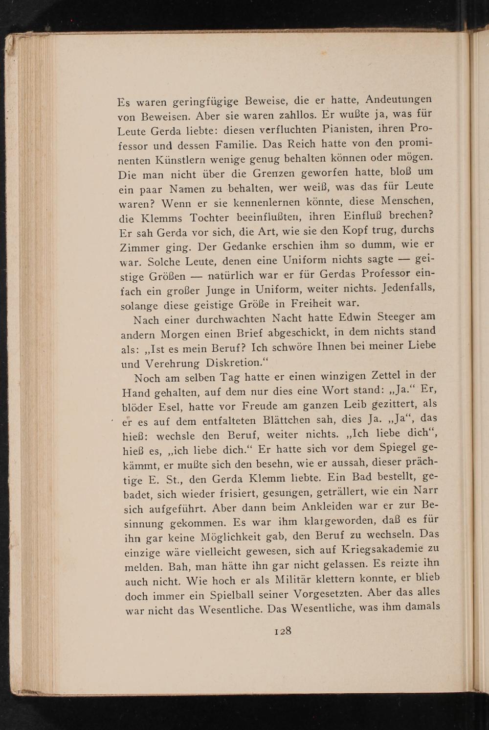 Noch am selben Tag hatte er einen winzigen Zettel in der Hand gehalten, auf dem nur dies eine Wort stand: ,, Ja." Er, blöder Esel, hatte vor Freude am ganzen Leib gezittert, als ⚫ er es auf dem entfalteten Blättchen sah, dies Ja. ,, Ja", das hieß: wechsle den Beruf, weiter nichts. ,, Ich liebe dich", hieß es ,,, ich liebe dich." Er hatte sich vor dem Spiegel gekämmt, er mußte sich den besehn, wie er aussah, dieser prächtige E. St., den Gerda Klemm liebte. Ein Bad bestellt, gebadet, sich wieder frisiert, gesungen, geträllert, wie ein Narr sich aufgeführt. Aber dann beim Ankleiden war er zur Besinnung gekommen. Es war ihm klargeworden, daß es für ihn gar keine Möglichkeit gab, den Beruf zu wechseln. Das einzige wäre vielleicht gewesen, sich auf Kriegsakademie zu melden. Bah, man hätte ihn gar nicht gelassen. Es reizte ihn auch nicht. Wie hoch er als Militär klettern konnte, er blieb doch immer ein Spielball seiner Vorgesetzten. Aber das alles war nicht das Wesentliche. Das Wesentliche, was ihm damals