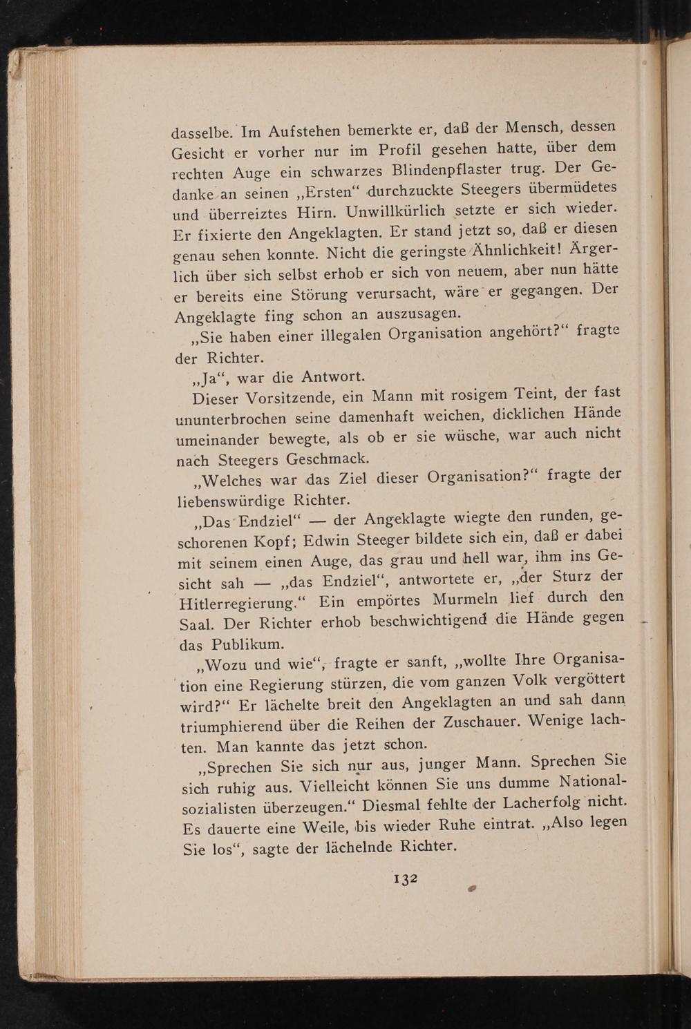 ,, Das Endziel" der Angeklagte wiegte den runden, geschorenen Kopf; Edwin Steeger bildete sich ein, daß er dabei mit seinem einen Auge, das grau und hell war, ihm ins Gesicht sah ,, das Endziel", antwortete er ,,, der Sturz der Hitlerregierung." Ein empörtes Murmeln lief durch den Saal. Der Richter erhob beschwichtigend die Hände gegen das Publikum.