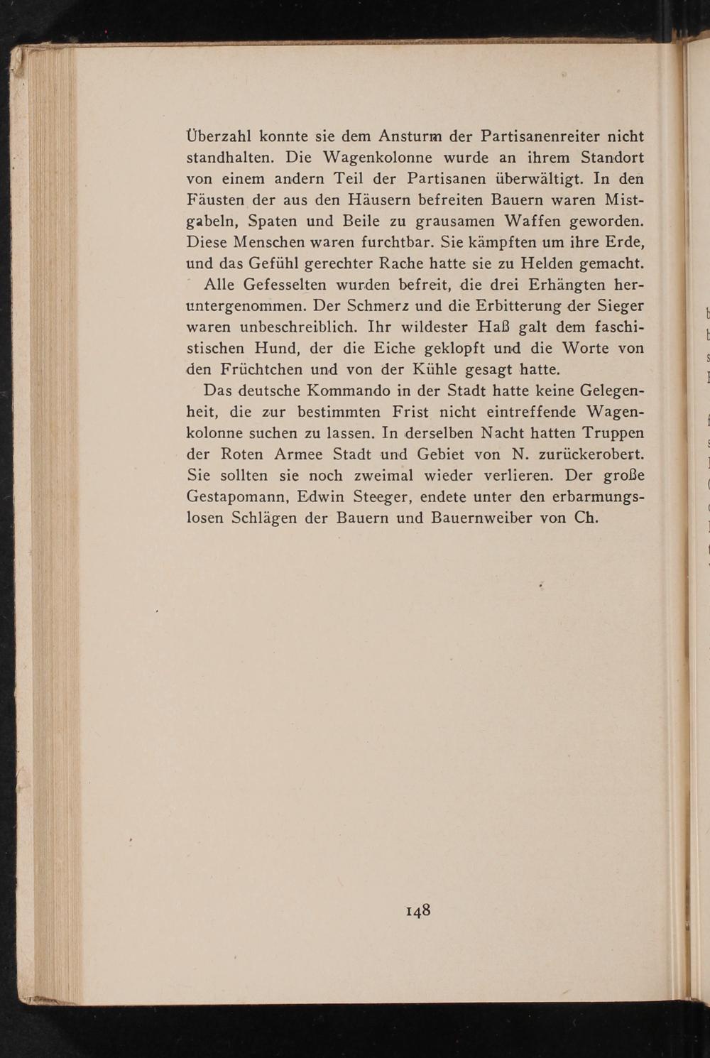 Das deutsche Kommando in der Stadt hatte keine Gelegen- heit, die zur bestimmten Frist nicht eintreffende Wagen- kolonne suchen zu lassen. In derselben Nacht hatten Truppen der Roten Armee Stadt und Gebiet von N. zurückerobert. Sie sollten sie noch zweimal wieder verlieren. Der große Gestapomann, Edwin Steeger, endete unter den erbarmungs- losen Schlägen der Bauern und Bauernweiber von Ch.
