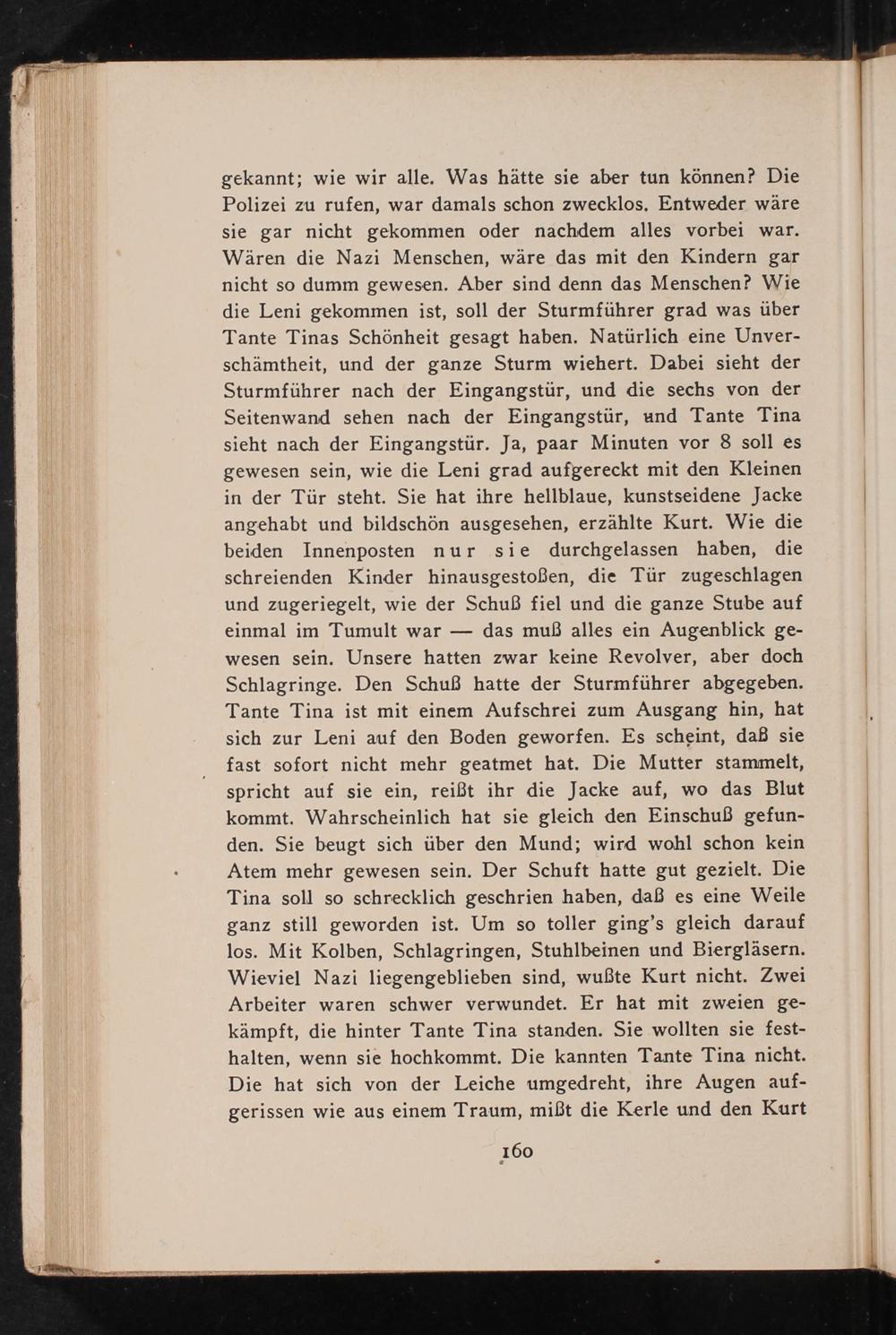 gekannt; wie wir alle. Was hätte sie aber tun können? Die Polizei zu rufen, war damals schon zwecklos. Entweder wäre sie gar nicht gekommen oder nachdem alles vorbei war. Wären die Nazi Menschen, wäre das mit den Kindern gar nicht so dumm gewesen. Aber sind denn das Menschen? Wie die Leni gekommen ist, soll der Sturmführer grad was über Tante Tinas Schönheit gesagt haben. Natürlich eine Unverschämtheit, und der ganze Sturm wiehert. Dabei sieht der Sturmführer nach der Eingangstür, und die sechs von der Seitenwand sehen nach der Eingangstür, und Tante Tina sieht nach der Eingangstür. Ja, paar Minuten vor 8 soll es gewesen sein, wie die Leni grad aufgereckt mit den Kleinen in der Tür steht. Sie hat ihre hellblaue, kunstseidene Jacke angehabt und bildschön ausgesehen, erzählte Kurt. Wie die beiden Innenposten nur sie durchgelassen haben, die schreienden Kinder hinausgestoßen, die Tür zugeschlagen und zugeriegelt, wie der Schuß fiel und die ganze Stube auf einmal im Tumult war das muß alles ein Augenblick gewesen sein. Unsere hatten zwar keine Revolver, aber doch Schlagringe. Den Schuß hatte der Sturmführer abgegeben. Tante Tina ist mit einem Aufschrei zum Ausgang hin, hat sich zur Leni auf den Boden geworfen. Es scheint, daß sie fast sofort nicht mehr geatmet hat. Die Mutter stammelt, spricht auf sie ein, reißt ihr die Jacke auf, wo das Blut kommt. Wahrscheinlich hat sie gleich den Einschuß gefunden. Sie beugt sich über den Mund; wird wohl schon kein Atem mehr gewesen sein. Der Schuft hatte gut gezielt. Die Tina soll so schrecklich geschrien haben, daß es eine Weile ganz still geworden ist. Um so toller ging's gleich darauf los. Mit Kolben, Schlagringen, Stuhlbeinen und Biergläsern. Wieviel Nazi liegengeblieben sind, wußte Kurt nicht. Zwei Arbeiter waren schwer verwundet. Er hat mit zweien gekämpft, die hinter Tante Tina standen. Sie wollten sie festhalten, wenn sie hochkommt. Die kannten Tante Tina nicht. Die hat sich von der Leiche umgedreht, ihre Augen aufgerissen wie aus einem Traum, mißt die Kerle und den Kurt