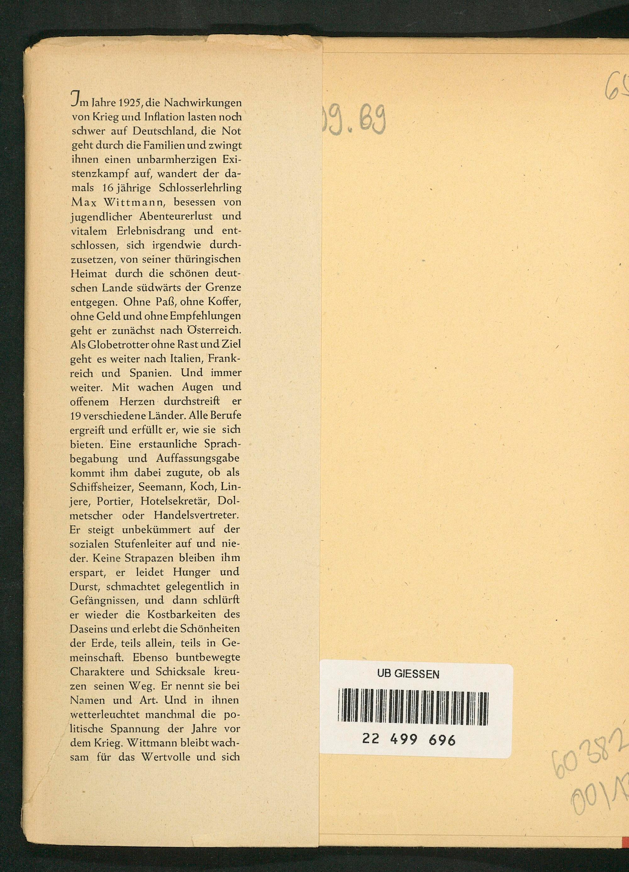Im Jahre 1925, die Nachwirkungen von Krieg und Inflation lasten noch schwer auf Deutschland , die Not geht durch die Familien und zwingt ihnen einen unbarmherzigen Existenzkampf auf, wandert der damals 16 jährige Schlosserlehrling Max Wittmann, besessen von jugendlicher Abenteurerlust und vitalem Erlebnisdrang und entschlossen, sich irgendwie durchzusetzen, von seiner thüringischen Heimat durch die schönen deutschen Lande südwärts der Grenze entgegen. Ohne Paß, ohne Koffer, ohne Geld und ohne Empfehlungen geht er zunächst nach Österreich . Als Globetrotter ohne Rast und Ziel geht es weiter nach Italien, Frankreich und Spanien . Und immer weiter. Mit wachen Augen und offenem Herzen durchstreift er 19 verschiedene Länder. Alle Berufe ergreift und erfüllt er, wie sie sich bieten. Eine erstaunliche Sprachbegabung und Auffassungsgabe kommt ihm dabei zugute, ob als Schiffsheizer, Seemann , Koch, Linjere, Portier, Hotelsekretär, Dolmetscher oder Handelsvertreter. Er steigt unbekümmert auf der sozialen Stufenleiter auf und nieder. Keine Strapazen bleiben ihm erspart, er leidet Hunger und Durst, schmachtet gelegentlich in Gefängnissen, und dann schlürft er wieder die Kostbarkeiten des Daseins und erlebt die Schönheiten der Erde, teils allein, teils in Gemeinschaft. Ebenso buntbewegte Charaktere und Schicksale kreuzen seinen Weg. Er nennt sie bei Namen und Art. Und in ihnen wetterleuchtet manchmal die politische Spannung der Jahre vor dem Krieg. Wittmann bleibt wachsam für das Wertvolle und sich