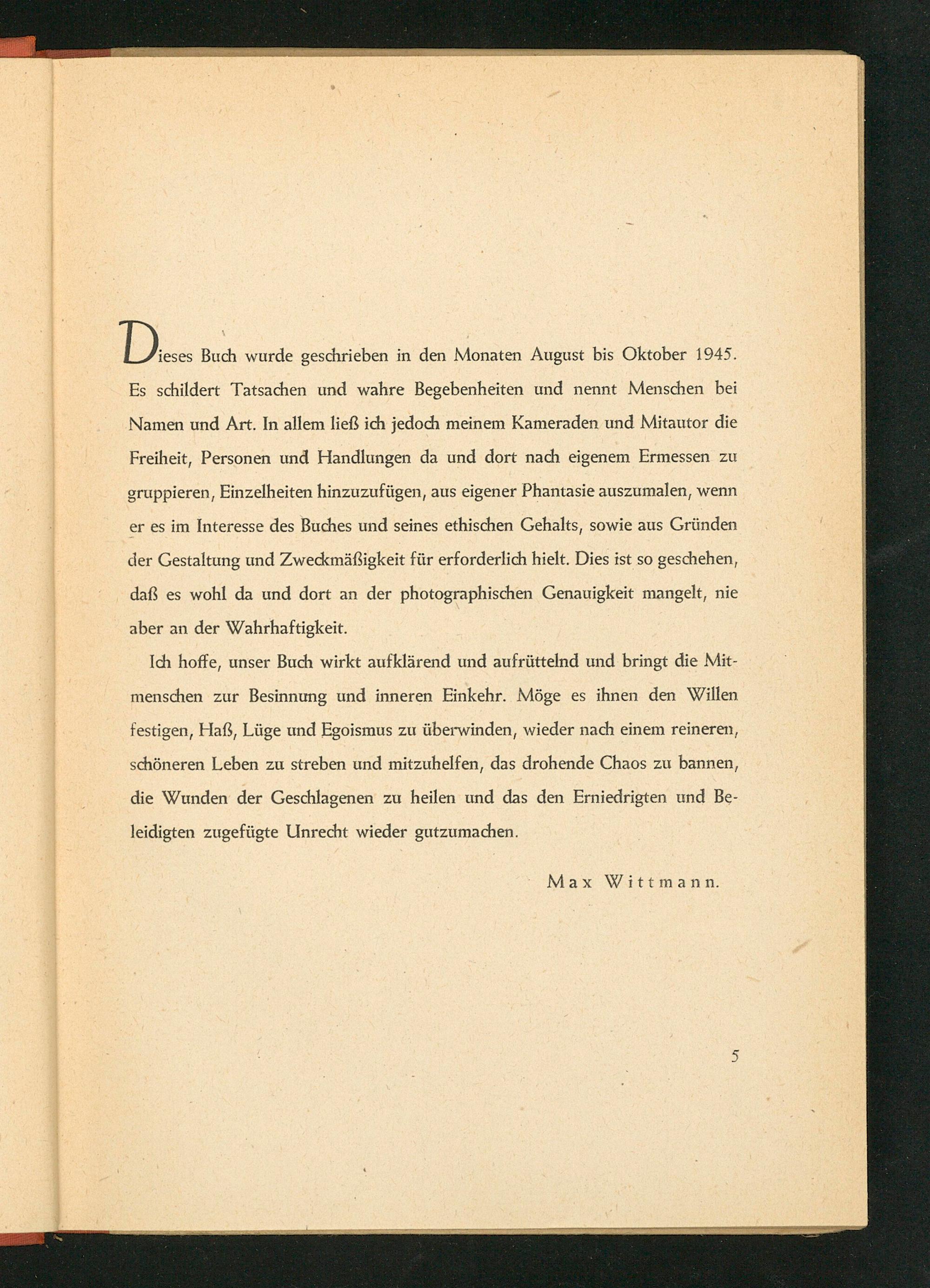 I).. Buch wurde geschrieben in den Monaten August bis Oktober 1945. Es schildert Tatsachen und wahre Begebenheiten und nennt Menschen bei Namen und Art. In allem ließ ich jedoch meinem Kameraden und Mitautor die Freiheit, Personen und Handlungen da und dort nach eigenem Ermessen zu gruppieren, Einzelheiten hinzuzufügen, aus eigener Phantasie auszumalen, wenn er es im Interesse des Buches und seines ethischen Gehalts, sowie aus Gründen der Gestaltung und Zweckmäßigkeit für erforderlich hielt. Dies ist so geschehen, daß es wohl da und dort an der photographischen Genauigkeit mangelt, nie aber an der Wahrhaftigkeit.