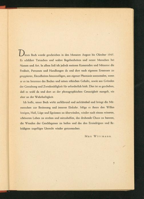 Ich hoffe, unser Buch wirkt aufklärend und aufrüttelnd und bringt die Mit- menschen zur Besinnung und inneren Einkehr. Möge es ihnen den Willen festigen, Haß, Lüge und Egoismus zu überwinden, wieder nach einem reineren, schöneren Leben zu streben und mitzuhelfen, das drohende Chaos zu bannen, die Wunden der Geschlagenen zu heilen und das den Erniedrigten und Be-