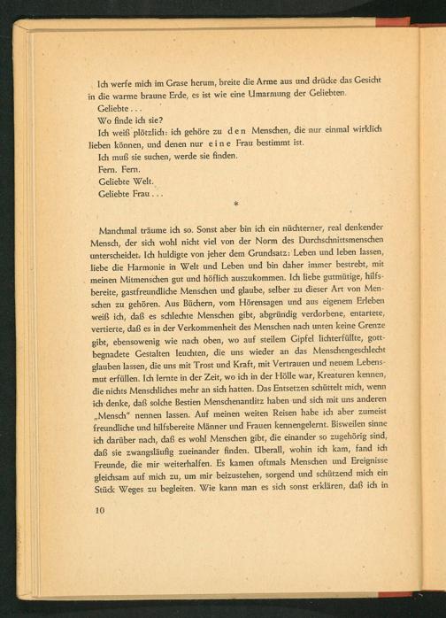 Ich werfe mich im Grase herum, breite die Arme aus und drücke das Gesicht in die warme braune Erde, es ist wie eine Umarmung der Geliebten. Geliebte... Wo finde ich sie? Ich weiß plötzlich: ich gehöre zu den Menschen, die nur einmal wirklich lieben können, und denen nur eine Frau bestimmt ist. Ich muß sie suchen, werde sie finden. Fern. Fern. Geliebte Welt.
