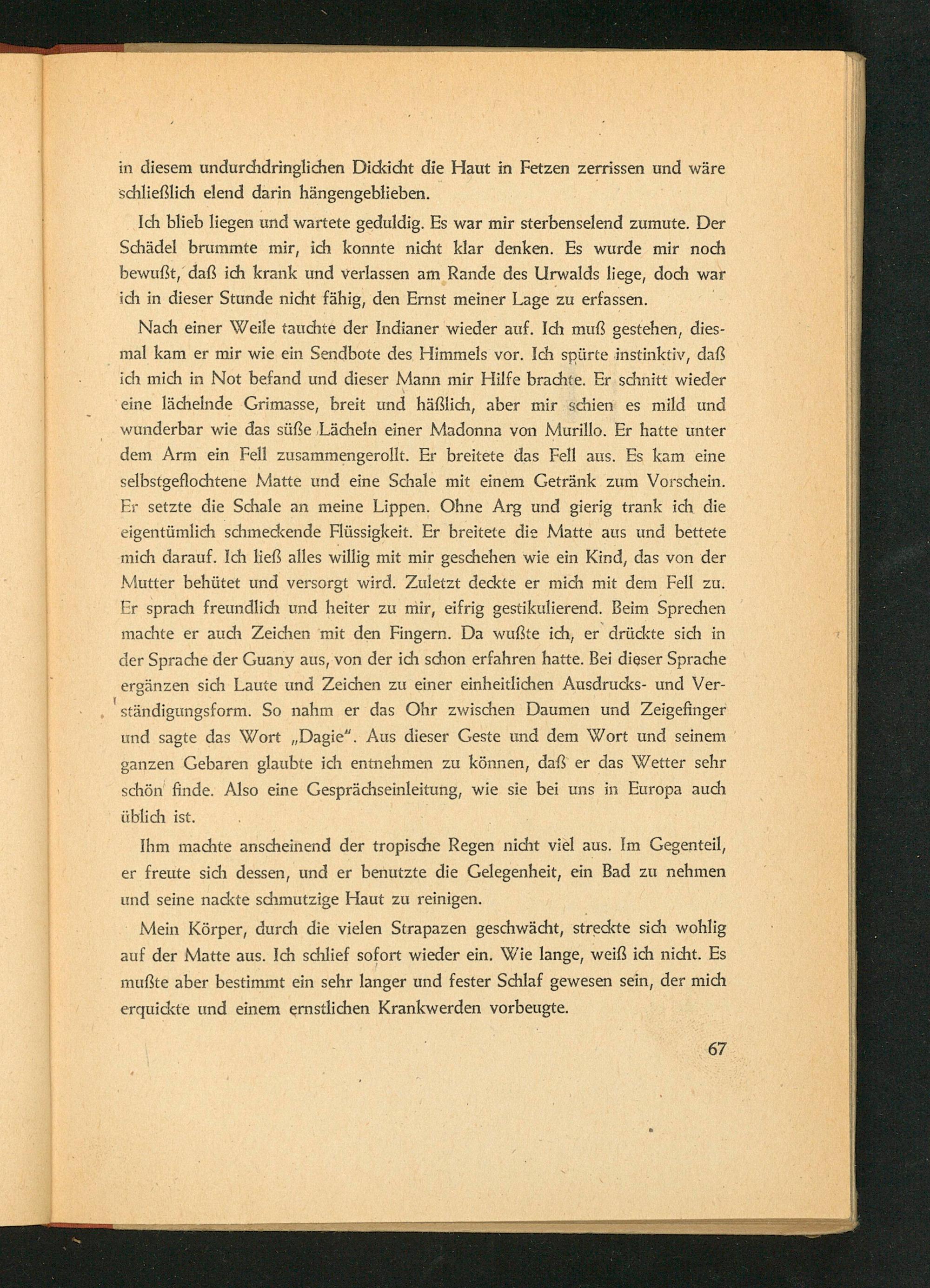 Nach einer Weile tauchte der Indianer wieder auf. Ich muß gestehen, diesmal kam er mir wie ein Sendbote des Himmels vor. Ich spürte instinktiv, daß ich mich in Not befand und dieser Mann mir Hilfe brachte. Er schnitt wieder eine lächelnde Grimasse, breit und häßlich, aber mir schien es mild und wunderbar wie das süße Lächeln einer Madonna von Murillo. Er hatte unter dem Arm ein Fell zusammengerollt. Er breitete das Fell aus. Es kam eine selbstgeflochtene Matte und eine Schale mit einem Getränk zum Vorschein. Er setzte die Schale an meine Lippen. Ohne Arg und gierig trank ich die eigentümlich schmeckende Flüssigkeit. Er breitete die Matte aus und bettete mich darauf. Ich ließ alles willig mit mir geschehen wie ein Kind, das von der Mutter behütet und versorgt wird. Zuletzt deckte er mich mit dem Fell zu. Er sprach freundlich und heiter zu mir, eifrig gestikulierend. Beim Sprechen machte er auch Zeichen mit den Fingern. Da wußte ich, er drückte sich in der Sprache der Guany aus, von der ich schon erfahren hatte. Bei dieser Sprache ergänzen sich Laute und Zeichen zu einer einheitlichen Ausdrucks- und Verständigungsform. So nahm er das Ohr zwischen Daumen und Zeigefinger und sagte das Wort„ Dagie". Aus dieser Geste und dem Wort und seinem ganzen Gebaren glaubte ich entnehmen zu können, daß er das Wetter sehr schön finde. Also eine Gesprächseinleitung, wie sie bei uns in Europa auch üblich ist.