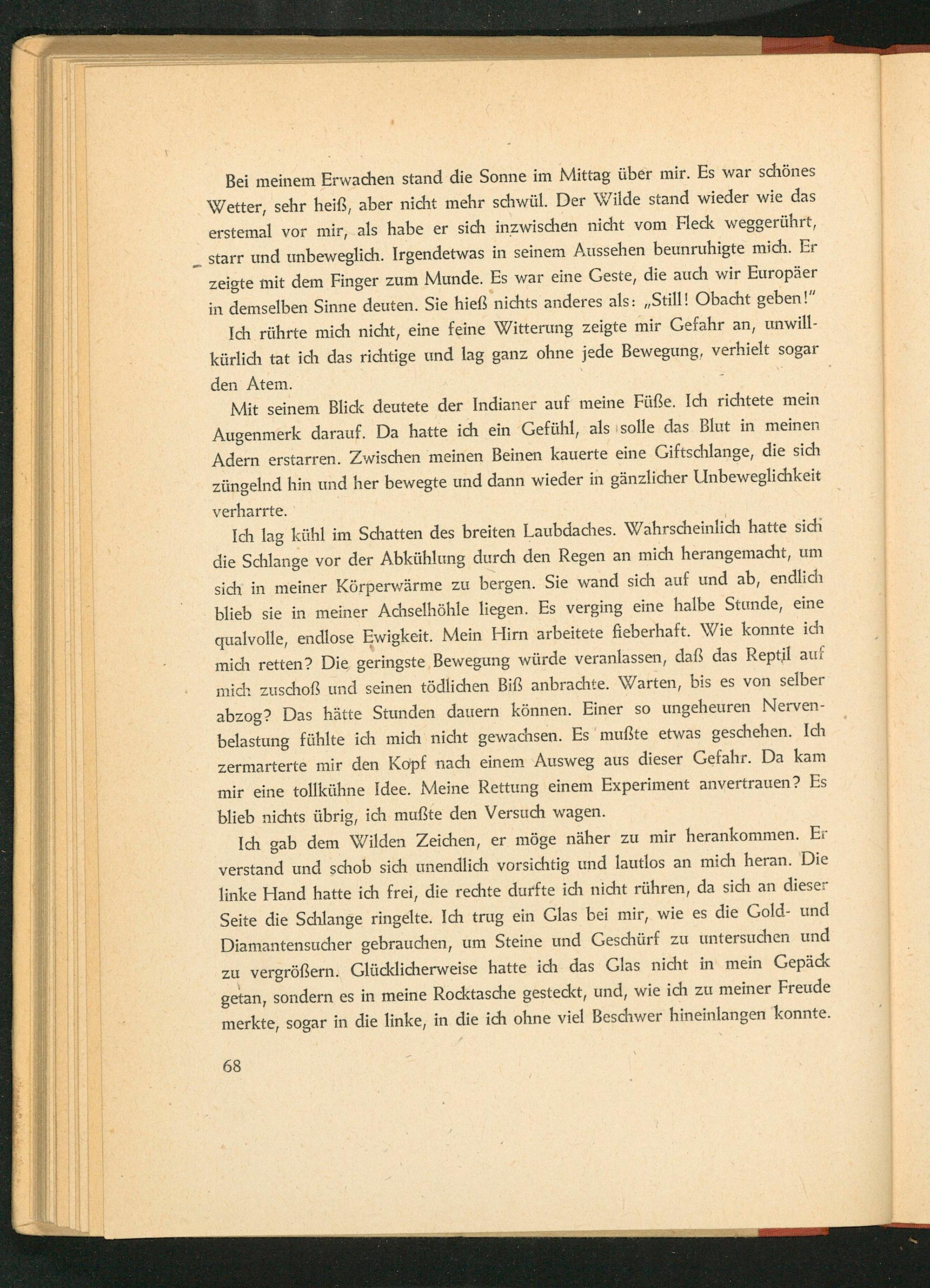 Ich lag kühl im Schatten des breiten Laubdaches. Wahrscheinlich hatte sich die Schlange vor der Abkühlung durch den Regen an mich herangemacht, um sich in meiner Körperwärme zu bergen. Sie wand sich auf und ab, endlich blieb sie in meiner Achselhöhle liegen. Es verging eine halbe Stunde, eine qualvolle, endlose Ewigkeit. Mein Hirn arbeitete fieberhaft. Wie konnte ich mich retten? Die geringste Bewegung würde veranlassen, daß das Reptil auf mich zuschoß und seinen tödlichen Biẞ anbrachte. Warten, bis es von selber abzog? Das hätte Stunden dauern können. Einer so ungeheuren Nervenbelastung fühlte ich mich nicht gewachsen. Es mußte etwas geschehen. Ich zermarterte mir den Kopf nach einem Ausweg aus dieser Gefahr. Da kam mir eine tollkühne Idee. Meine Rettung einem Experiment anvertrauen? Es blieb nichts übrig, ich mußte den Versuch wagen.