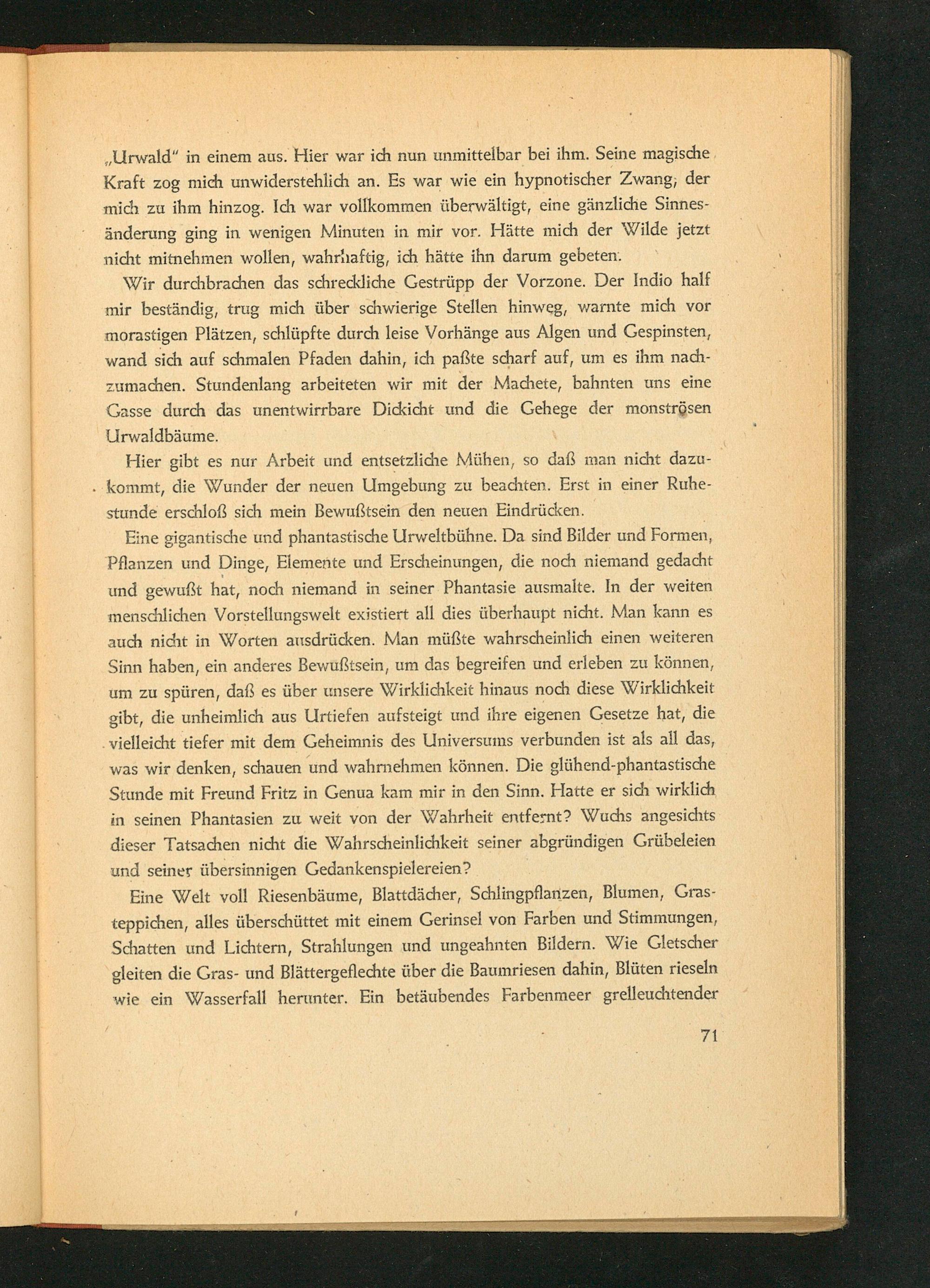 Wir durchbrachen das schreckliche Gestrüpp der Vorzone. Der Indio half mir beständig, trug mich über schwierige Stellen hinweg, warnte mich vor morastigen Plätzen, schlüpfte durch leise Vorhänge aus Algen und Gespinsten, wand sich auf schmalen Pfaden dahin, ich paßte scharf auf, um es ihm nachzumachen. Stundenlang arbeiteten wir mit der Machete, bahnten uns eine Gasse durch das unentwirrbare Dickicht und die Gehege der monströsen Urwaldbäume.