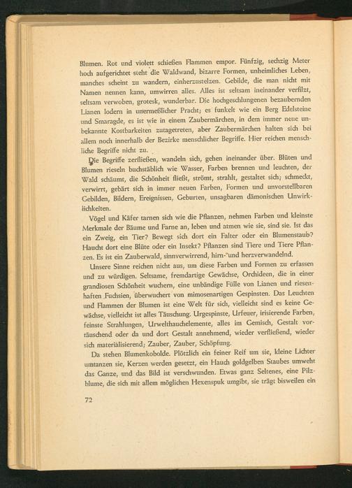 Blumen. Rot und violett schießen Flammen empor. Fünfzig, sechzig Meter hoch aufgerichtet steht die Waldwand, bizarre Formen, unheimliches Leben, manches scheint zu wandern, einherzustelzen. Gebilde, die man nicht mit Namen nennen kann, umwirren alles. Alles ist seltsam ineinander verfilzt, seltsam verwoben, grotesk, wunderbar. Die hochgeschlungenen bezaubernden Lianen lodern in unermeßlicher Pracht; es funkelt wie ein Berg Edelsteine und Smaragde, es ist wie in einem Zaubermärchen, in dem immer neue unbekannte Kostbarkeiten zutagetreten, aber Zaubermärchen halten sich bei allem noch innerhalb der Bezirke menschlicher Begriffe. Hier reichen menschliche Begriffe nicht zu.