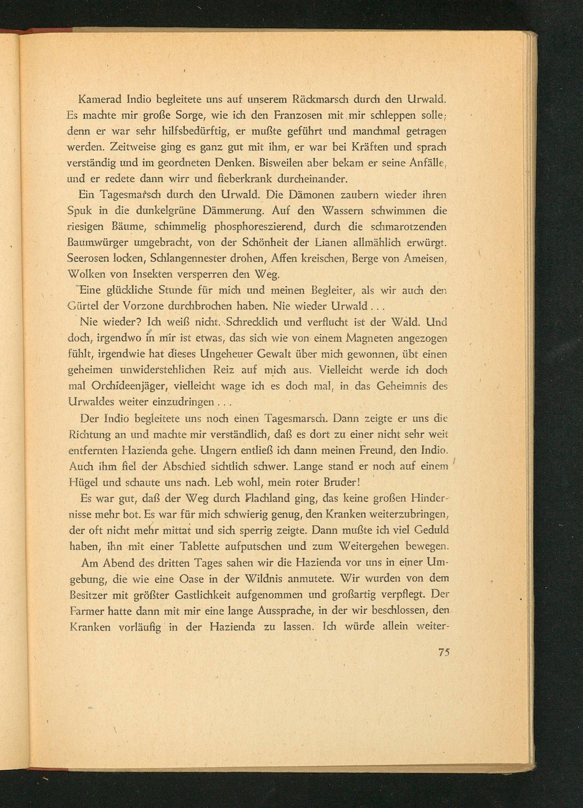 Kamerad Indio begleitete uns auf unserem Rückmarsch durch den Urwald. Es machte mir große Sorge, wie ich den Franzosen mit mir schleppen solle; denn er war sehr hilfsbedürftig, er mußte geführt und manchmal getragen werden. Zeitweise ging es ganz gut mit ihm, er war bei Kräften und sprach verständig und im geordneten Denken. Bisweilen aber bekam er seine Anfälle, und er redete dann wirr und fieberkrank durcheinander.