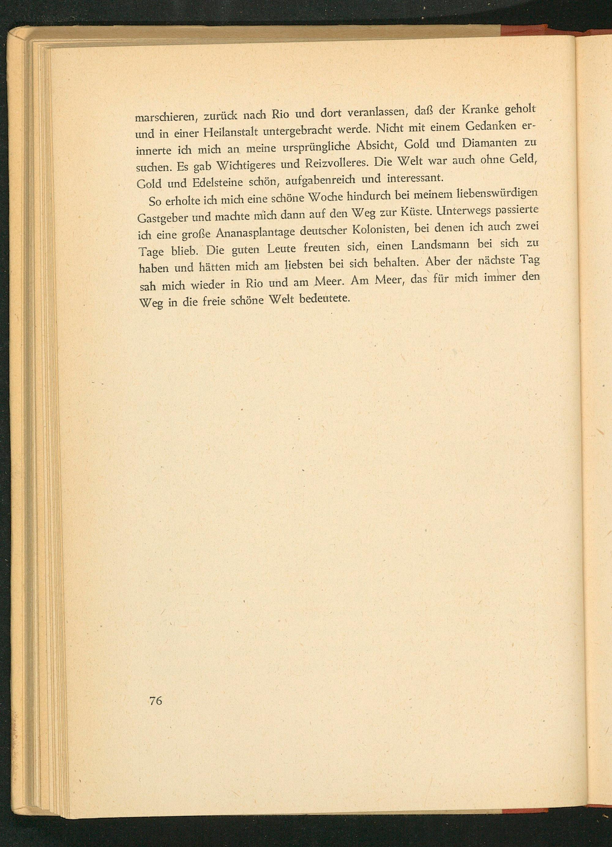 So erholte ich mich eine schöne Woche hindurch bei meinem liebenswürdigen Gastgeber und machte mich dann auf den Weg zur Küste. Unterwegs passierte ich eine große Ananasplantage deutscher Kolonisten, bei denen ich auch zwei Tage blieb. Die guten Leute freuten sich, einen Landsmann bei sich zu haben und hätten mich am liebsten bei sich behalten. Aber der nächste Tag sah mich wieder in Rio und am Meer. Am Meer, das für mich immer den Weg in die freie schöne Welt bedeutete.