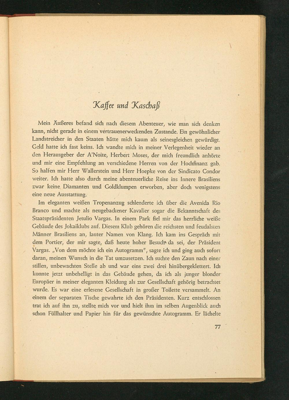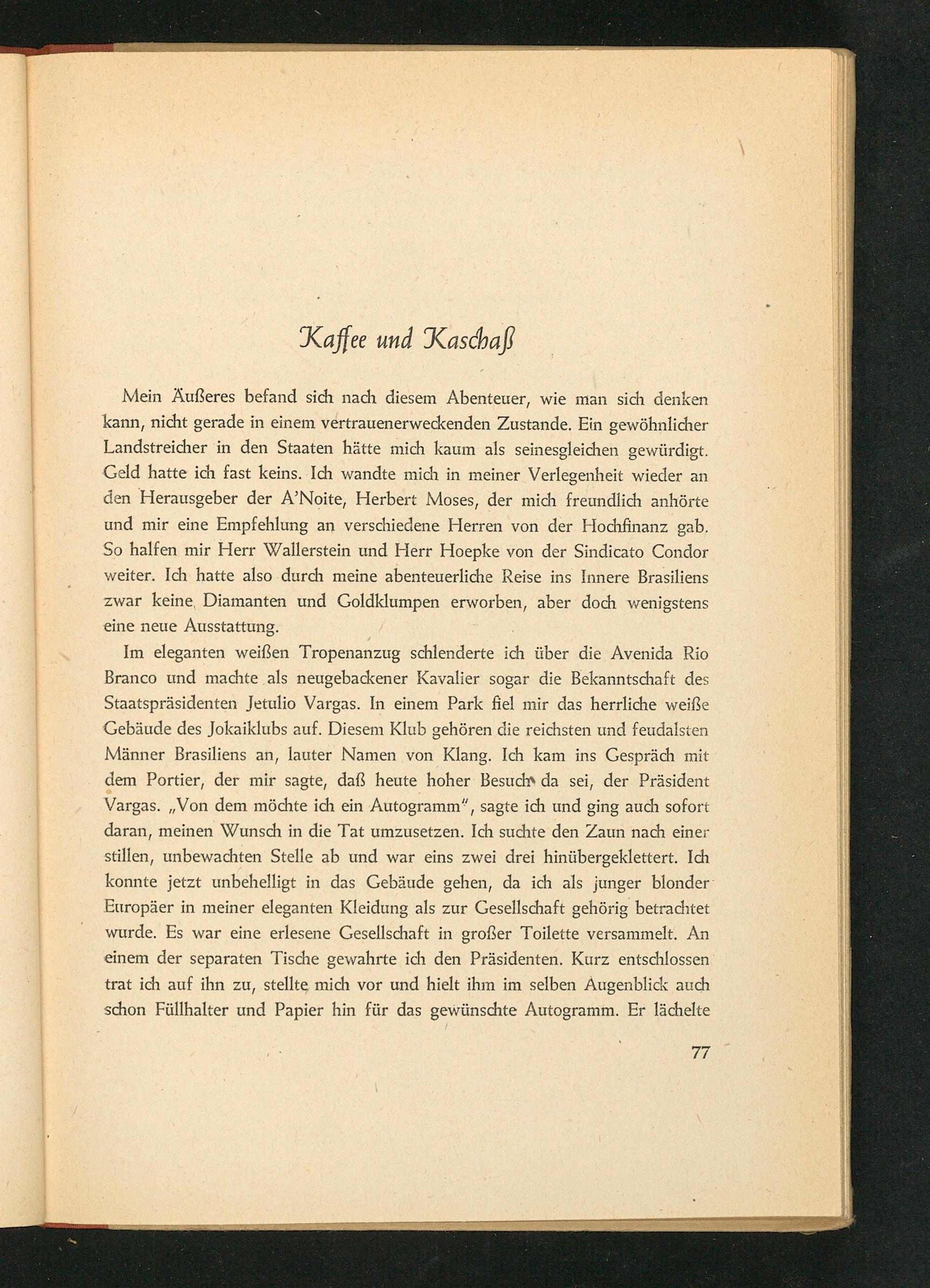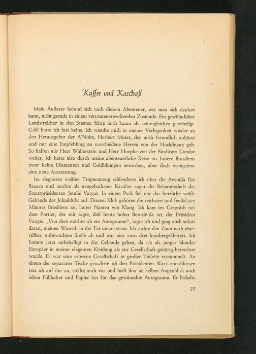 Im eleganten weißen Tropenanzug schlenderte ich über die Avenida Rio Branco und machte als neugebackener Kavalier sogar die Bekanntschaft des Staatspräsidenten Jetulio Vargas. In einem Park fiel mir das herrliche weiße Gebäude des Jokaiklubs auf. Diesem Klub gehören die reichsten und feudalsten Männer Brasiliens an, lauter Namen von Klang. Ich kam ins Gespräch mit dem Portier, der mir sagte, daß heute hoher Besuch da sei, der Präsident Vargas. ,, Von dem möchte ich ein Autogramm", sagte ich und ging auch sofort daran, meinen Wunsch in die Tat umzusetzen. Ich suchte den Zaun nach einer stillen, unbewachten Stelle ab und war eins zwei drei hinübergeklettert. Ich konnte jetzt unbehelligt in das Gebäude gehen, da ich als junger blonder Europäer in meiner eleganten Kleidung als zur Gesellschaft gehörig betrachtet wurde. Es war eine erlesene Gesellschaft in großer Toilette versammelt. An einem der separaten Tische gewahrte ich den Präsidenten. Kurz entschlossen trat ich auf ihn zu, stellte mich vor und hielt ihm im selben Augenblick auch schon Füllhalter und Papier hin für das gewünschte Autogramm. Er lächelte