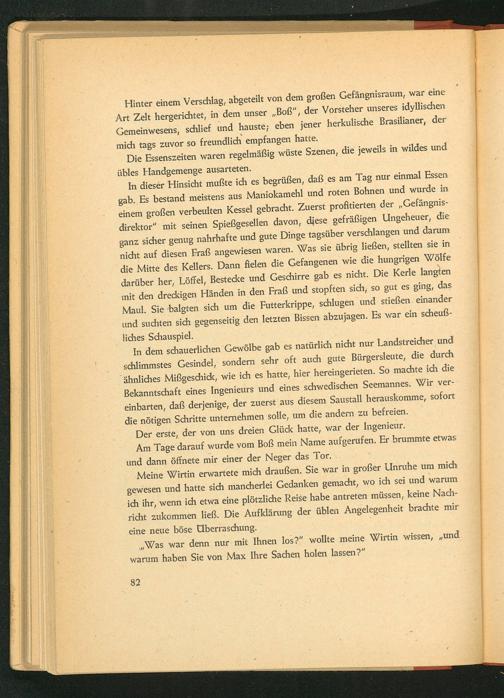 Hinter einem Verschlag, abgeteilt von dem großen Gefängnisraum, war eine Art Zelt hergerichtet, in dem unser Boß", der Vorsteher unseres idyllischen Gemeinwesens, schlief und hauste; eben jener herkulische Brasilianer, der mich tags zuvor so freundlich empfangen hatte.