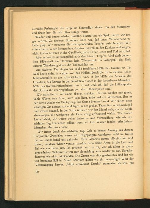 Am nächsten Tag gingen wir in die furchtbare Hölle des Durstes ein. Ich weiß heute nicht, in welcher von den Höllen, durch die ich in meinem Leben hindurchmußte, es am schrecklichsten war: in der Hölle des Monsun, des Urwaldes, des Durstes in den Kordillieren oder in der furchtbaren Menschenhölle des Konzentrationslagers; nur so viel weiß ich, daß die Höllenqualen des Durstes die unerträglichsten von allen Höllenqualen sind.
