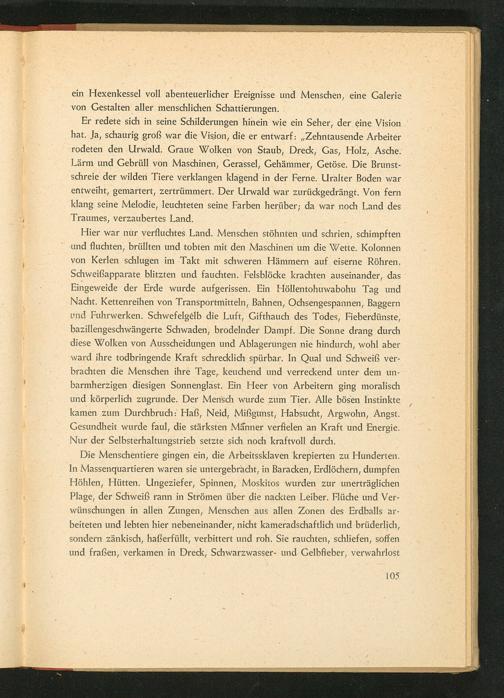Er redete sich in seine Schilderungen hinein wie ein Seher, der eine Vision hat. Ja, schaurig groß war die Vision, die er entwarf:„ Zehntausende Arbeiter rodeten den Urwald. Graue Wolken von Staub, Dreck, Gas, Holz, Asche. Lärm und Gebrüll von Maschinen, Gerassel, Gehämmer, Getöse. Die Brunstschreie der wilden Tiere verklangen klagend in der Ferne. Uralter Boden war entweiht, gemartert, zertrümmert. Der Urwald war zurückgedrängt. Von fern klang seine Melodie, leuchteten seine Farben herüber; da war noch Land des Traumes, verzaubertes Land.
