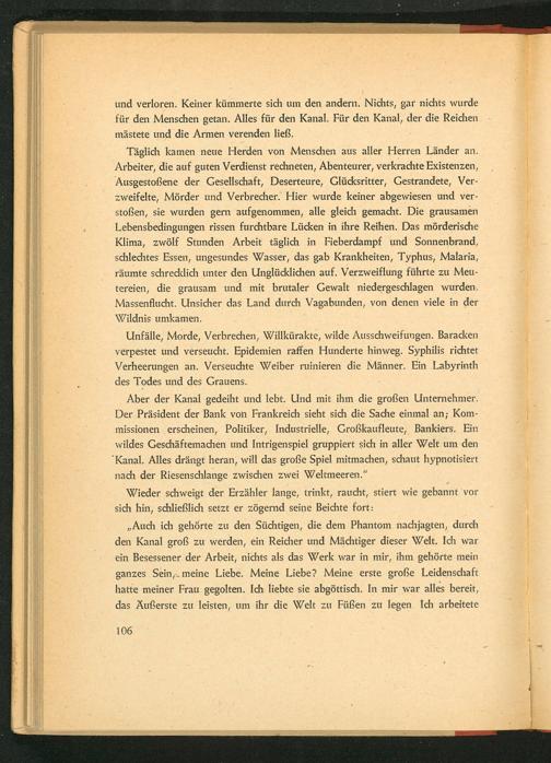 ,, Auch ich gehörte zu den Süchtigen, die dem Phantom nachjagten, durch den Kanal groß zu werden, ein Reicher und Mächtiger dieser Welt. Ich war ein Besessener der Arbeit, nichts als das Werk war in mir, ihm gehörte mein ganzes Sein, meine Liebe. Meine Liebe? Meine erste große Leidenschaft hatte meiner Frau gegolten. Ich liebte sie abgöttisch. In mir war alles bereit, das Äußerste zu leisten, um ihr die Welt zu Füßen zu legen. Ich arbeitete