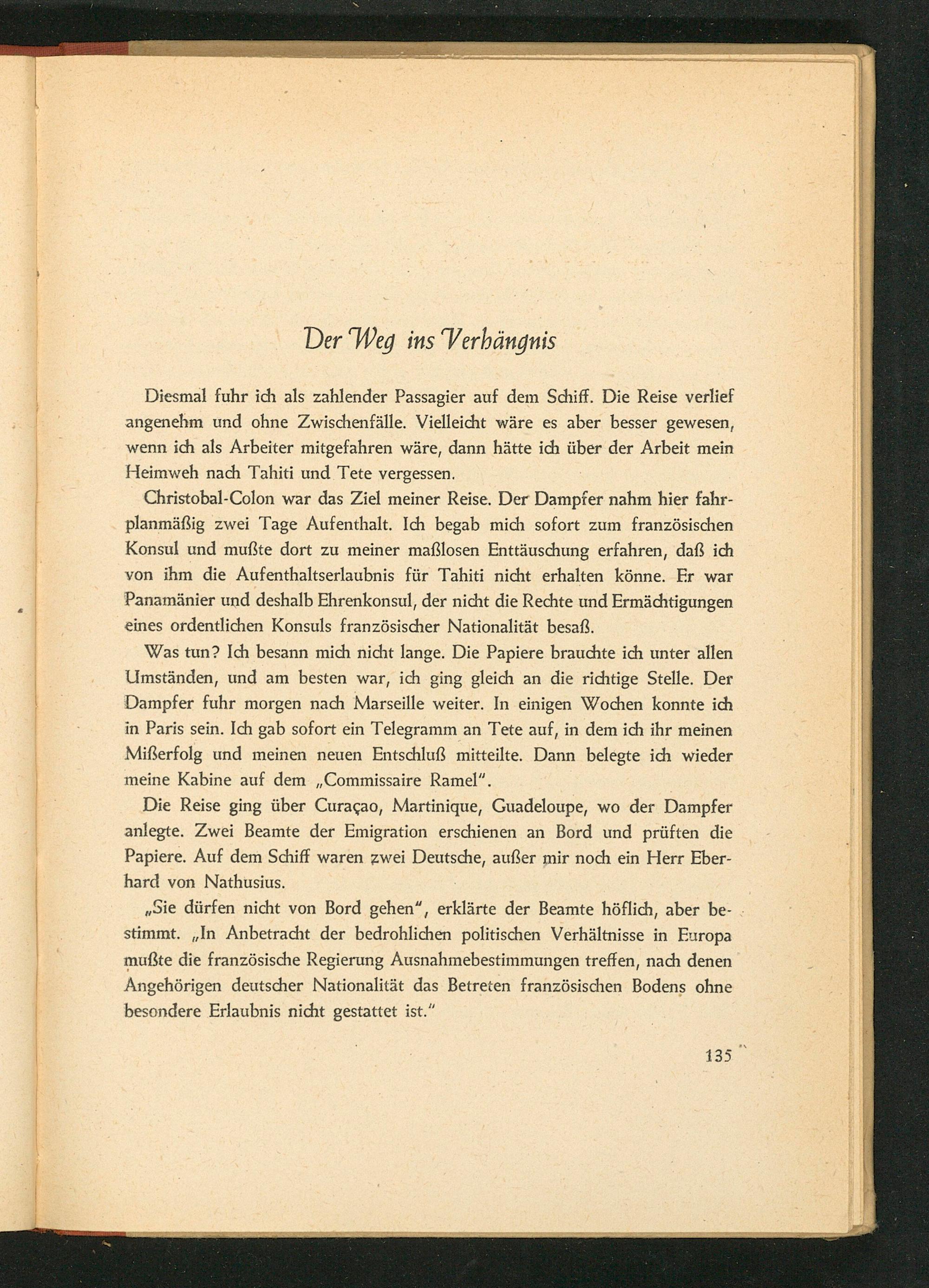 Diesmal fuhr ich als zahlender Passagier auf dem Schiff. Die Reise verlief angenehm und ohne Zwischenfälle. Vielleicht wäre es aber besser gewesen, wenn ich als Arbeiter mitgefahren wäre, dann hätte ich über der Arbeit mein Heimweh nach Tahiti und Tete vergessen.
