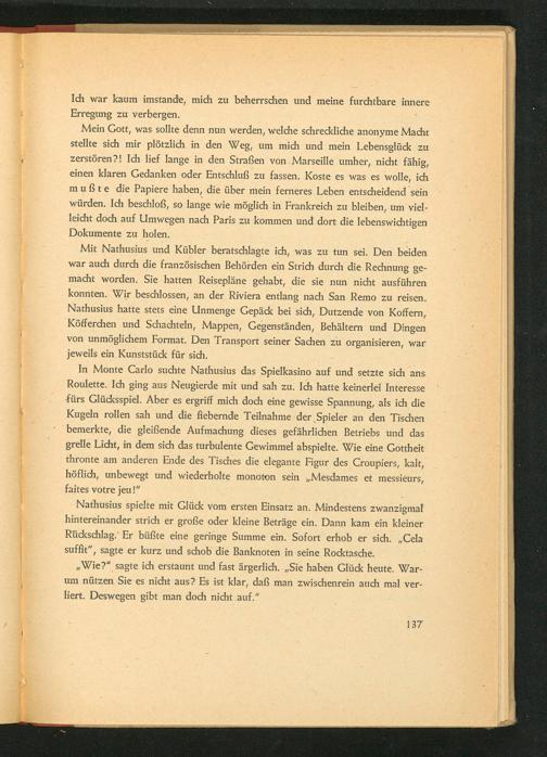 Nathusius spielte mit Glück vom ersten Einsatz an. Mindestens zwanzigmal hintereinander strich er große oder kleine Beträge ein. Dann kam ein kleiner Rückschlag.‘ Er büßte eine geringe Summe ein. Sofort erhob er sich. ‚Cela suffit”, sagte er kurz und schob die Banknoten in seine Rocktasche.