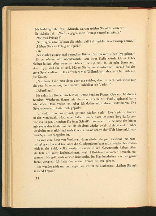 Es kam eine Serie von Verlusten, dann wieder ein paar Gewinne; ein paarmal ging es hin und her, aber die Glückssträhne kam nicht wieder. Ich verbiẞ mich in das Spiel, wollte wenigstens noch eine Gewinnserie haben. Aber sie ließ sich nicht herbeizwingen. Mein Häufchen Banknoten schmolz zusammen. Ich griff nach meiner Brieftasche. Im Handumdrehen war der ganze Inhalt verspielt. Ich hatte dreitausend Francs bei mir gehabt.