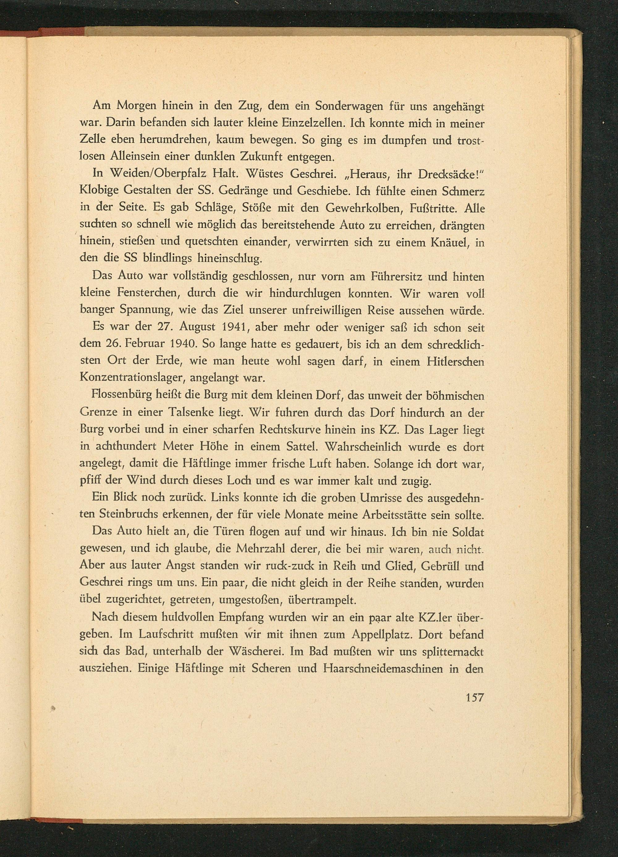 In Weiden/ Oberpfalz Halt. Wüstes Geschrei." Heraus, ihr Drecksäcke!" Klobige Gestalten der SS. Gedränge und Geschiebe. Ich fühlte einen Schmerz in der Seite. Es gab Schläge, Stöße mit den Gewehrkolben, Fußtritte. Alle suchten so schnell wie möglich das bereitstehende Auto zu erreichen, drängten hinein, stießen und quetschten einander, verwirrten sich zu einem Knäuel, in den die SS blindlings hineinschlug.