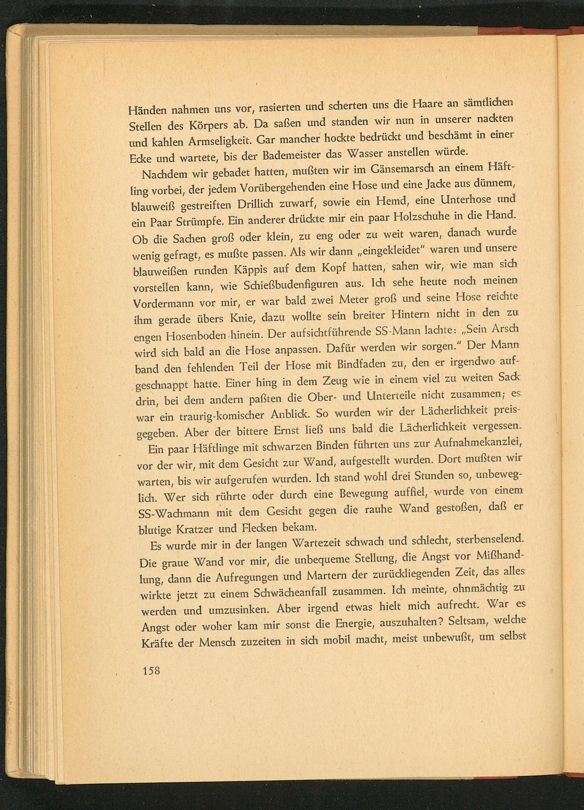 Nachdem wir gebadet hatten, mußten wir im Gänsemarsch an einem Häftling vorbei, der jedem Vorübergehenden eine Hose und eine Jacke aus dünnem, blauweiß gestreiften Drillich zuwarf, sowie ein Hemd, eine Unterhose und ein Paar Strümpfe. Ein anderer drückte mir ein paar Holzschuhe in die Hand. Ob die Sachen groß oder klein, zu eng oder zu weit waren, danach wurde wenig gefragt, es mußte passen. Als wir dann eingekleidet" waren und unsere blauweißen runden Käppis auf dem Kopf hatten, sahen wir, wie man sich vorstellen kann, wie Schießbudenfiguren aus. Ich sehe heute noch meinen Vordermann vor mir, er war bald zwei Meter groß und seine Hose reichte ihm gerade übers Knie, dazu wollte sein breiter Hintern nicht in den zu engen Hosenboden hinein. Der aufsichtführende SS- Mann lachte: ,, Sein Arsch wird sich bald an die Hose anpassen. Dafür werden wir sorgen." Der Mann band den fehlenden Teil der Hose mit Bindfaden zu, den er irgendwo aufgeschnappt hatte. Einer hing in dem Zeug wie in einem viel zu weiten Sack drin, bei dem andern paẞten die Ober- und Unterteile nicht zusammen; es war ein traurig- komischer Anblick. So wurden wir der Lächerlichkeit preisgegeben. Aber der bittere Ernst ließ uns bald die Lächerlichkeit vergessen. Ein paar Häftlinge mit schwarzen Binden führten uns zur Aufnahmekanzlei, vor der wir, mit dem Gesicht zur Wand, aufgestellt wurden. Dort mußten wir warten, bis wir aufgerufen wurden. Ich stand wohl drei Stunden so, unbeweglich. Wer sich rührte oder durch eine Bewegung auffiel, wurde von einem SS- Wachmann mit dem Gesicht gegen die rauhe Wand gestoßen, daß er blutige Kratzer und Flecken bekam.