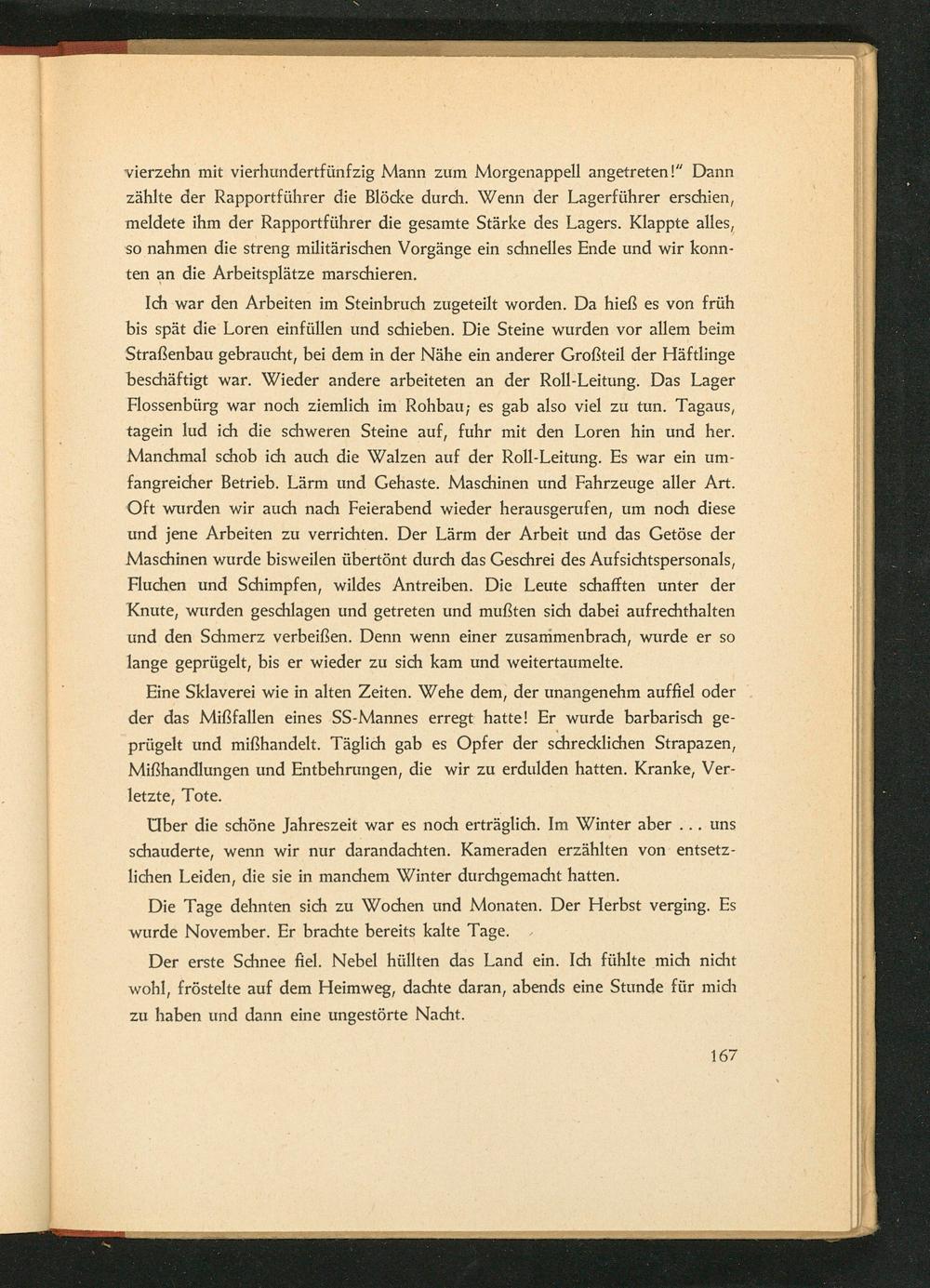 Eine Sklaverei wie in alten Zeiten. Wehe dem, der unangenehm auffiel oder der das Miẞfallen eines SS- Mannes erregt hatte! Er wurde barbarisch geprügelt und miẞhandelt. Täglich gab es Opfer der schrecklichen Strapazen, Mißhandlungen und Entbehrungen, die wir zu erdulden hatten. Kranke, Verletzte, Tote.