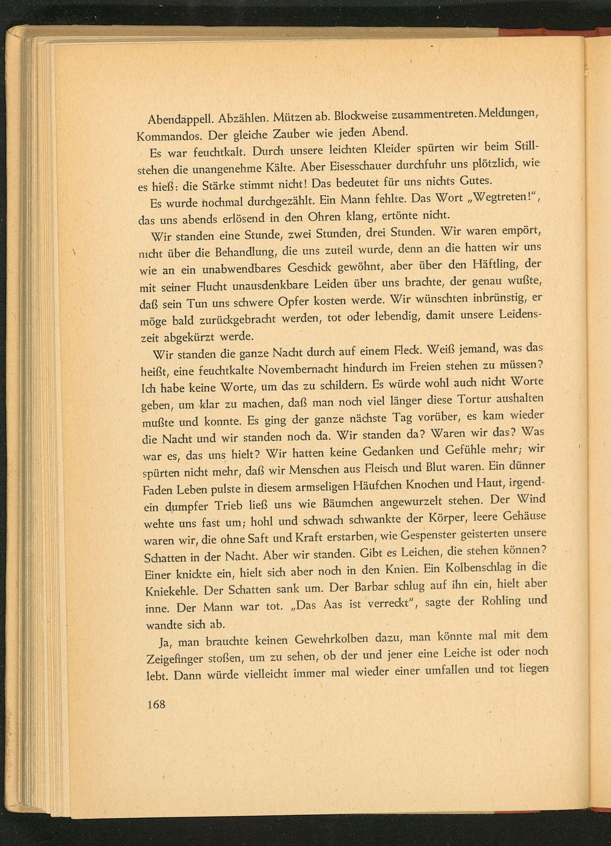 Wir standen die ganze Nacht durch auf einem Fleck. Weiß jemand, was das heißt, eine feuchtkalte Novembernacht hindurch im Freien stehen zu müssen? Ich habe keine Worte, um das zu schildern. Es würde wohl auch nicht Worte geben, um klar zu machen, daß man noch viel länger diese Tortur aushalten mußte und konnte. Es ging der ganze nächste Tag vorüber, es kam wieder die Nacht und wir standen noch da. Wir standen da? Waren wir das? Was war es, das uns hielt? Wir hatten keine Gedanken und Gefühle mehr; wir spürten nicht mehr, daß wir Menschen aus Fleisch und Blut waren. Ein dünner Faden Leben pulste in diesem armseligen Häufchen Knochen und Haut, irgend- ein dumpfer Trieb ließ uns wie Bäumchen angewurzelt stehen. Der Wind wehte uns fast um; hohl und schwach schwankte der Körper, leere Gehäuse waren wir, die ohne Saft und Kraft erstarben, wie Gespenster geisterten unsere Schatten in der Nacht. Aber wir standen. Gibt es Leichen, die stehen können? Einer knickte ein, hielt sich aber noch in den Knien. Ein Kolbenschlag in die Kniekehle. Der Schatten sank um. Der Barbar schlug auf ihn ein, hielt aber inne. Der Mann war tot.„Das Aas ist verreckt”, sagte der Rohling und wandte sich ab.