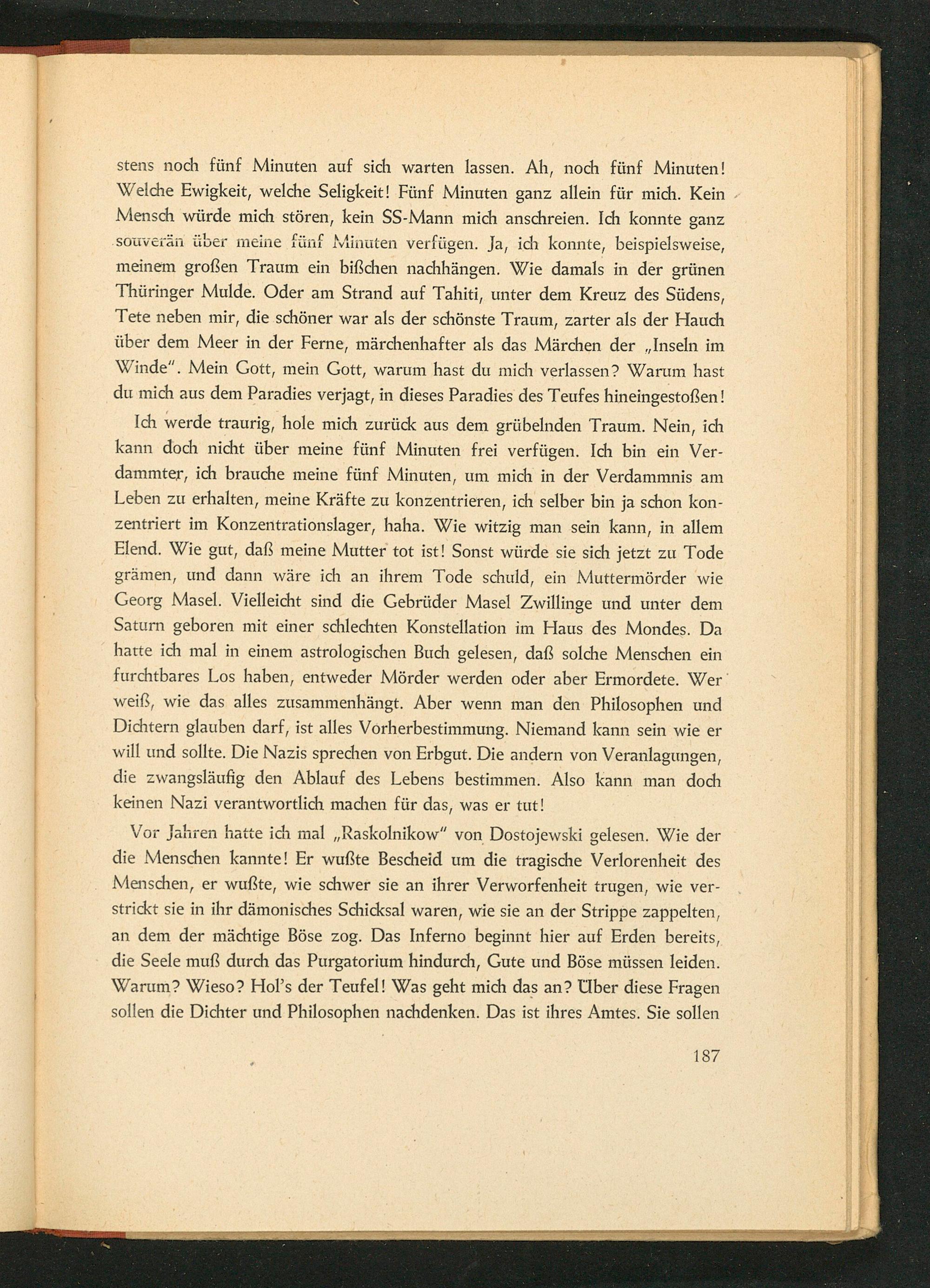 Vor Jahren hatte ich mal ,, Raskolnikow" von Dostojewski gelesen. Wie der die Menschen kannte! Er wußte Bescheid um die tragische Verlorenheit des Menschen, er wußte, wie schwer sie an ihrer Verworfenheit trugen, wie verstrickt sie in ihr dämonisches Schicksal waren, wie sie an der Strippe zappelten, an dem der mächtige Böse zog. Das Inferno beginnt hier auf Erden bereits, die Seele muß durch das Purgatorium hindurch, Gute und Böse müssen leiden. Warum? Wieso? Hol's der Teufel! Was geht mich das an? Über diese Fragen sollen die Dichter und Philosophen nachdenken. Das ist ihres Amtes. Sie sollen