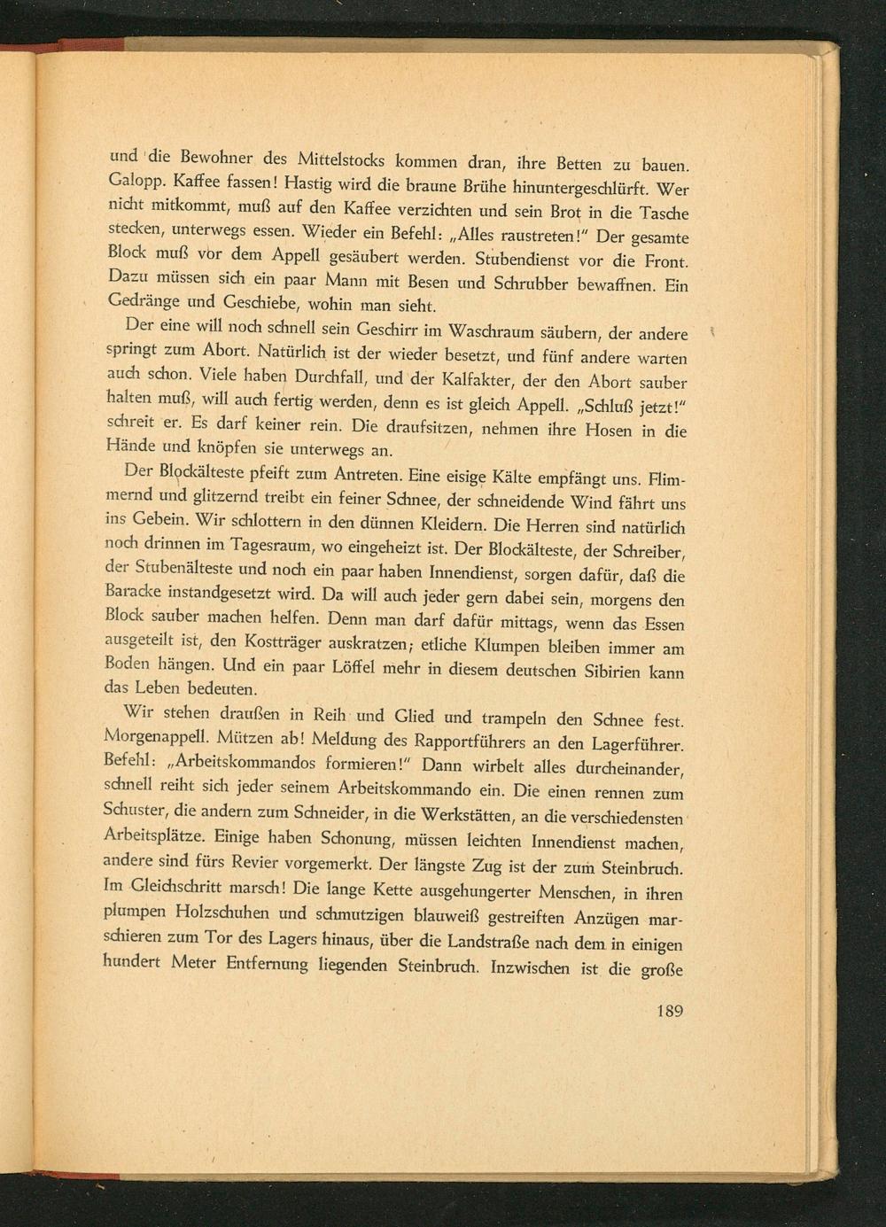 Der Blockälteste pfeift zum Antreten. Eine eisige Kälte empfängt uns. Flimmernd und glitzernd treibt ein feiner Schnee, der schneidende Wind fährt uns ins Gebein. Wir schlottern in den dünnen Kleidern. Die Herren sind natürlich noch drinnen im Tagesraum, wo eingeheizt ist. Der Blockälteste, der Schreiber, der Stubenälteste und noch ein paar haben Innendienst, sorgen dafür, daß die Baracke instandgesetzt wird. Da will auch jeder gern dabei sein, morgens den Block sauber machen helfen. Denn man darf dafür mittags, wenn das Essen ausgeteilt ist, den Kostträger auskratzen; etliche Klumpen bleiben immer am Boden hängen. Und ein paar Löffel mehr in diesem deutschen Sibirien kann das Leben bedeuten.