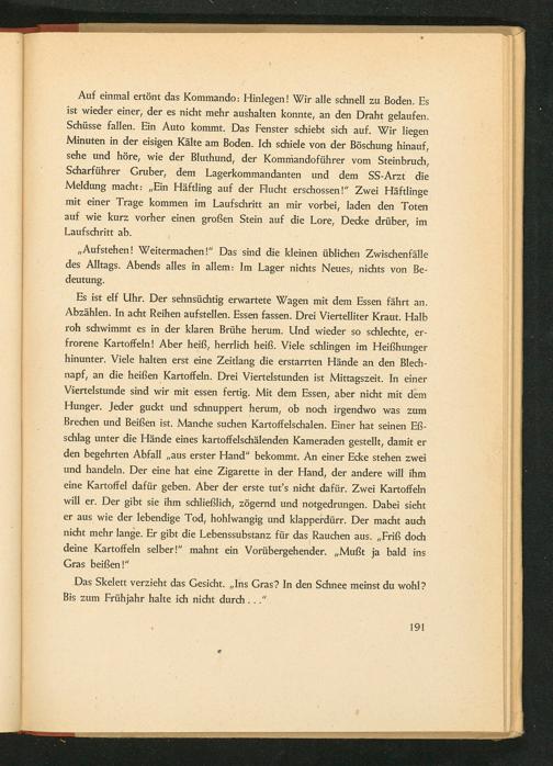Auf einmal ertönt das Kommando: Hinlegen! Wir alle schnell zu Boden. Es ist wieder einer, der es nicht mehr aushalten konnte, an den Draht gelaufen. Schüsse fallen. Ein Auto kommt. Das Fenster schiebt sich auf. Wir liegen Minuten in der eisigen Kälte am Boden. Ich schiele von der Böschung hinauf, sehe und höre, wie der Bluthund, der Kommandoführer vom Steinbruch, Scharführer Gruber, dem Lagerkommandanten und dem SS - Arzt die Meldung macht:„ Ein Häftling auf der Flucht erschossen!" Zwei Häftlinge mit einer Trage kommen im Laufschritt an mir vorbei, laden den Toten auf wie kurz vorher einen großen Stein auf die Lore, Decke drüber, im Laufschritt ab.