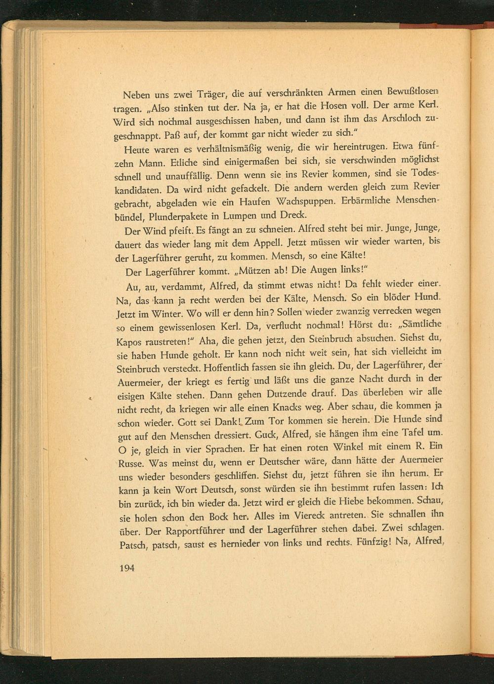 Au, au, verdammt, Alfred, da stimmt etwas nicht! Da fehlt wieder einer. Na, das kann ja recht werden bei der Kälte, Mensch. So ein blöder Hund. Jetzt im Winter. Wo will er denn hin? Sollen wieder zwanzig verrecken wegen so einem gewissenlosen Kerl. Da, verflucht nochmal! Hörst du:„Sämtliche Kapos raustreten!” Aha, die gehen jetzt, den Steinbruch absuchen. Siehst du, sie haben Hunde geholt. Er kann noch nicht weit sein, hat sich vielleicht im Steinbruch versteckt. Hoffentlich fassen sie ihn gleich. Du, der Lagerführer, der Auermeier, der kriegt es fertig und läßt uns die ganze Nacht durch in der eisigen Kälte stehen. Dann gehen Dutzende drauf. Das überleben wir alle nicht recht, da kriegen wir alle einen Knacks weg. Aber schau, die kommen ja schon wieder. Gott sei Dank! Zum Tor kommen sie herein. Die Hunde sind gut auf den Menschen dressiert. Guck, Alfred, sie hängen ihm eine Tafel um.