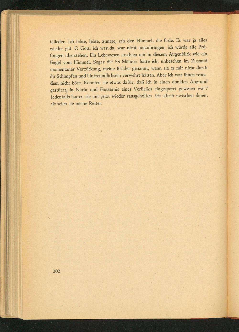 Glieder. Ich lebte, lebte, atmete, sah den Himmel, die Erde. Es war ja alles wieder gut. O Gott, ich war da, war nicht umzubringen, ich würde alle Prüfungen überstehen. Ein Lebewesen erschien mir in diesem Augenblick wie ein Engel vom Himmel. Sogar die SS - Männer hätte ich, unbesehen im Zustand momentaner Verzückung, meine Brüder genannt, wenn sie es mir nicht durch ihr Schimpfen und Unfreundlichsein verwehrt hätten. Aber ich war ihnen trotzdem nicht böse. Konnten sie etwas dafür, daß ich in einen dunklen Abgrund gestürzt, in Nacht und Finsternis eines Verließes eingesperrt gewesen war? Jedenfalls hatten sie mir jetzt wieder rausgeholfen. Ich schritt zwischen ihnen, als seien sie meine Retter.