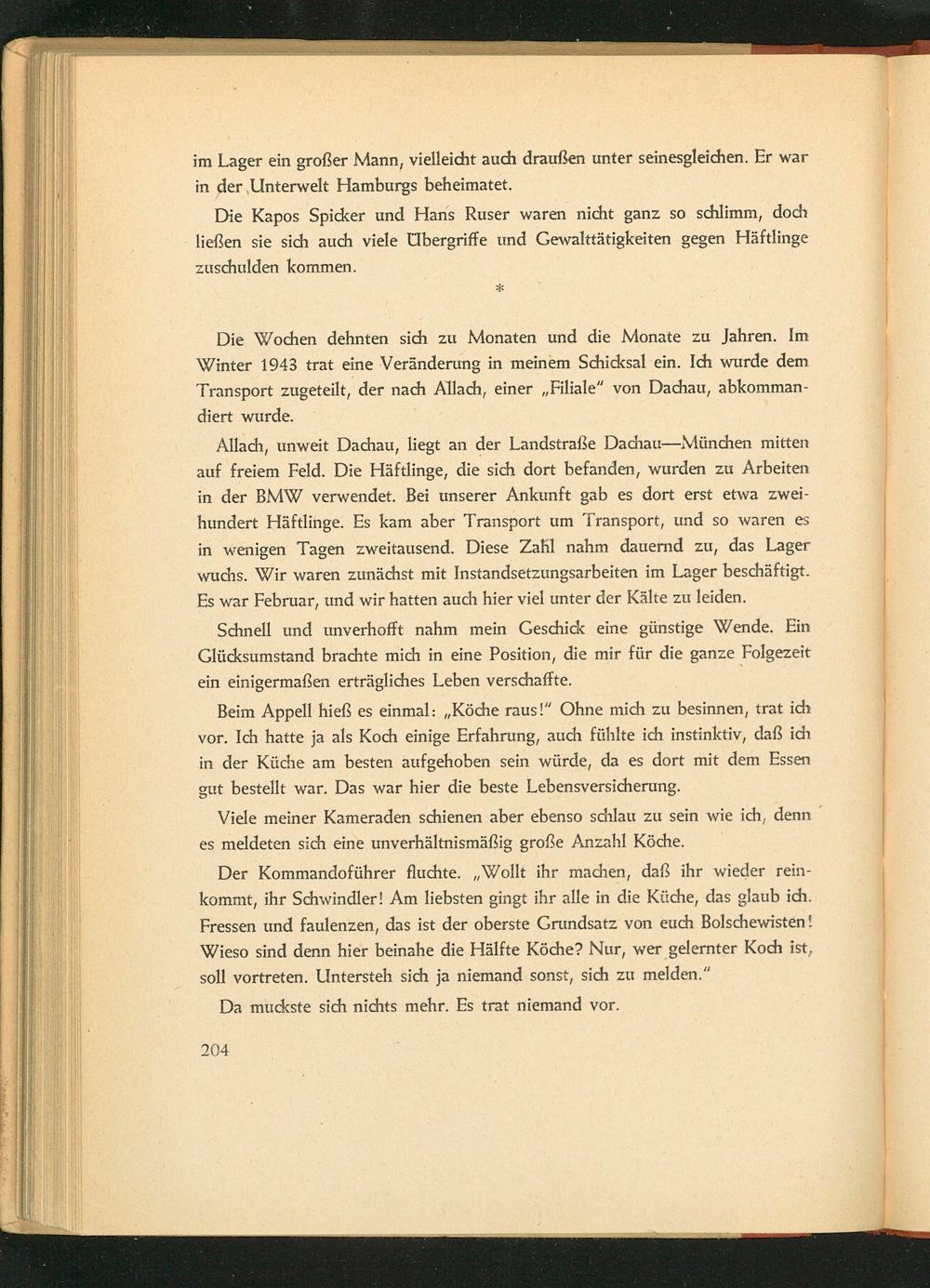 Die Wochen dehnten sich zu Monaten und die Monate zu Jahren. Im Winter 1943 trat eine Veränderung in meinem Schicksal ein. Ich wurde dem Transport zugeteilt, der nach Allach, einer ,, Filiale" von Dachau , abkommandiert wurde.