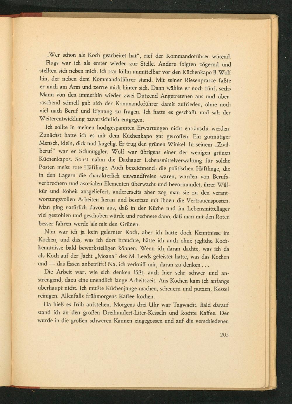 Ich sollte in meinen hochgespannten Erwartungen nicht enttäuscht werden. Zunächst hatte ich es mit dem Küchenkapo gut getroffen. Ein gutmütiger Mensch, klein, dick und kugelig. Er trug den grünen Winkel. In seinem„ Zivilberuf" war er Schmuggler. Wolf war übrigens einer der wenigen grünen Küchenkapos. Sonst nahm die Dachauer Lebensmittelverwaltung für solche Posten meist rote Häftlinge. Auch bezeichnend: die politischen Häftlinge, die in den Lagern die charakterlich einwandfreien waren, wurden von Berufsverbrechern und asozialen Elementen überwacht und bevormundet, ihrer Willkür und Roheit ausgeliefert, andererseits aber zog man sie zu den verantwortungsvollen Arbeiten heran und besetzte mit ihnen die Vertrauensposten. Man ging natürlich davon aus, daß in der Küche und im Lebensmittellager viel gestohlen und geschoben würde und rechnete dann, daß man mit den Roten besser fahren werde als mit den Grünen.