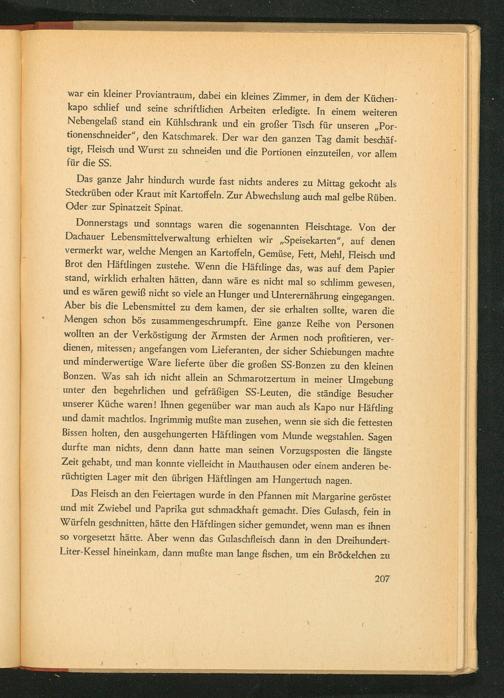 Donnerstags und sonntags waren die sogenannten Fleischtage. Von der Dachauer Lebensmittelverwaltung erhielten wir Speisekarten", auf denen vermerkt war, welche Mengen an Kartoffeln, Gemüse, Fett, Mehl, Fleisch und Brot den Häftlingen zustehe. Wenn die Häftlinge das, was auf dem Papier stand, wirklich erhalten hätten, dann wäre es nicht mal so schlimm gewesen, und es wären gewiß nicht so viele an Hunger und Unterernährung eingegangen. Aber bis die Lebensmittel zu dem kamen, der sie erhalten sollte, waren die Mengen schon bös zusammengeschrumpft. Eine ganze Reihe von Personen wollten an der Verköstigung der Ärmsten der Armen noch profitieren, verdienen, mitessen; angefangen vom Lieferanten, der sicher Schiebungen machte und minderwertige Ware lieferte über die großen SS- Bonzen zu den kleinen Bonzen. Was sah ich nicht allein an Schmarotzertum in meiner Umgebung unter den begehrlichen und gefräßigen SS- Leuten, die ständige Besucher unserer Küche waren! Ihnen gegenüber war man auch als Kapo nur Häftling und damit machtlos. Ingrimmig mußte man zusehen, wenn sie sich die fettesten Bissen holten, den ausgehungerten Häftlingen vom Munde wegstahlen. Sagen durfte man nichts, denn dann hatte man seinen Vorzugsposten die längste Zeit gehabt, und man konnte vielleicht in Mauthausen oder einem anderen berüchtigten Lager mit den übrigen Häftlingen am Hungertuch nagen.