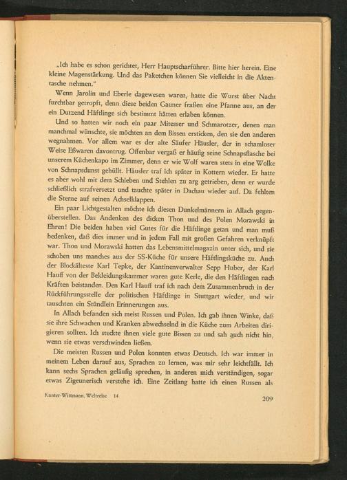 Die meisten Russen und Polen konnten etwas Deutsch . Ich war immer in meinem Leben darauf aus, Sprachen zu lernen, was mir sehr leichtfällt. Ich kann sechs Sprachen geläufig sprechen, in anderen mich verständigen, sogar etwas Zigeunerisch verstehe ich. Eine Zeitlang hatte ich einen Russen als