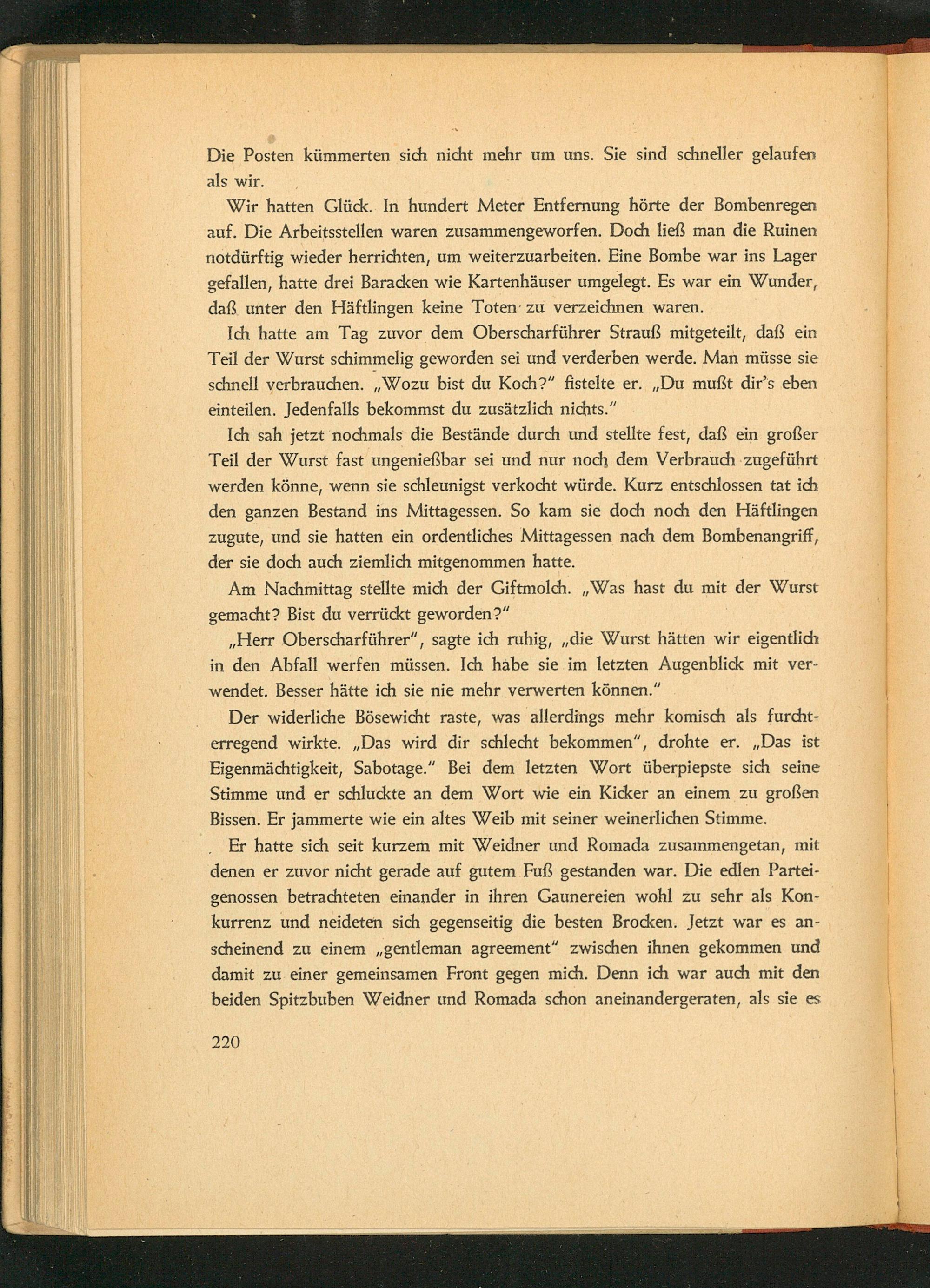 Ich sah jetzt nochmals die Bestände durch und stellte fest, daß ein großer Teil der Wurst fast ungenießbar sei und nur noch dem Verbrauch zugeführt werden könne, wenn sie schleunigst verkocht würde. Kurz entschlossen tat ich den ganzen Bestand ins Mittagessen. So kam sie doch noch den Häftlingen zugute, und sie hatten ein ordentliches Mittagessen nach dem Bombenangriff, der sie doch auch ziemlich mitgenommen hatte.