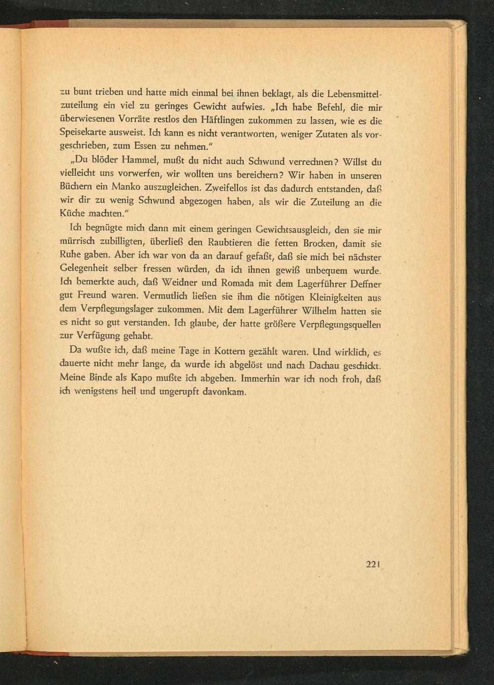 Da wußte ich, daß meine Tage in Kottern gezählt waren. Und wirklich, es dauerte nicht mehr lange, da wurde ich abgelöst und nach Dachau geschickt. Meine Binde als Kapo mußte ich abgeben. Immerhin war ich noch froh, daß ich wenigstens heil und ungerupft davonkam.