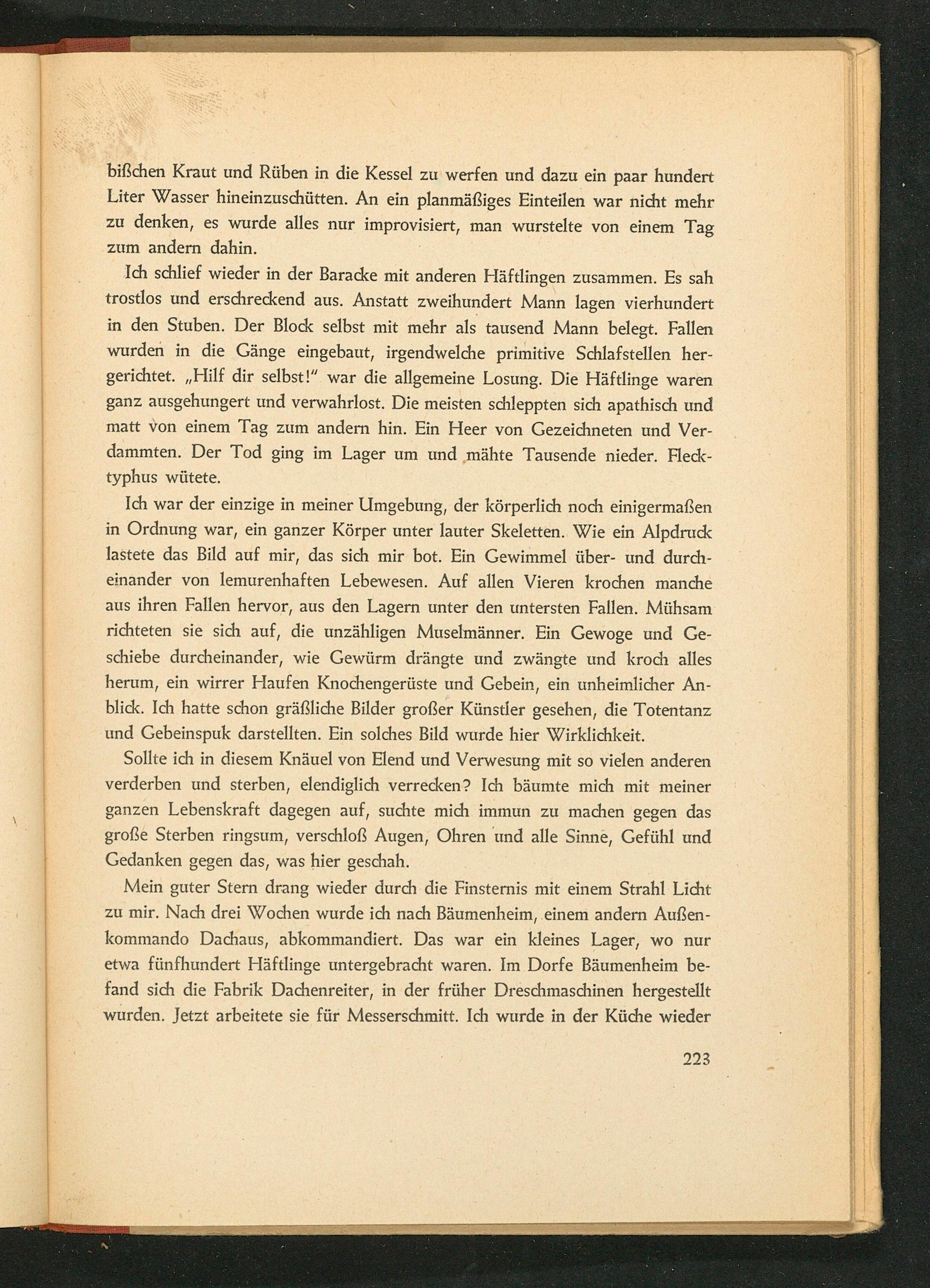 Mein guter Stern drang wieder durch die Finsternis mit einem Strahl Licht zu mir. Nach drei Wochen wurde ich nach Bäumenheim, einem andern Außen- kommando Dachaus, abkommandiert. Das war ein kleines Lager, wo nur etwa fünfhundert Häftlinge untergebracht waren. Im Dorfe Bäumenheim be- fand sich die Fabrik Dachenreiter, in der früher Dreschmaschinen hergestellt wurden. Jetzt arbeitete sie für Messerschmitt . Ich wurde in der Küche wieder