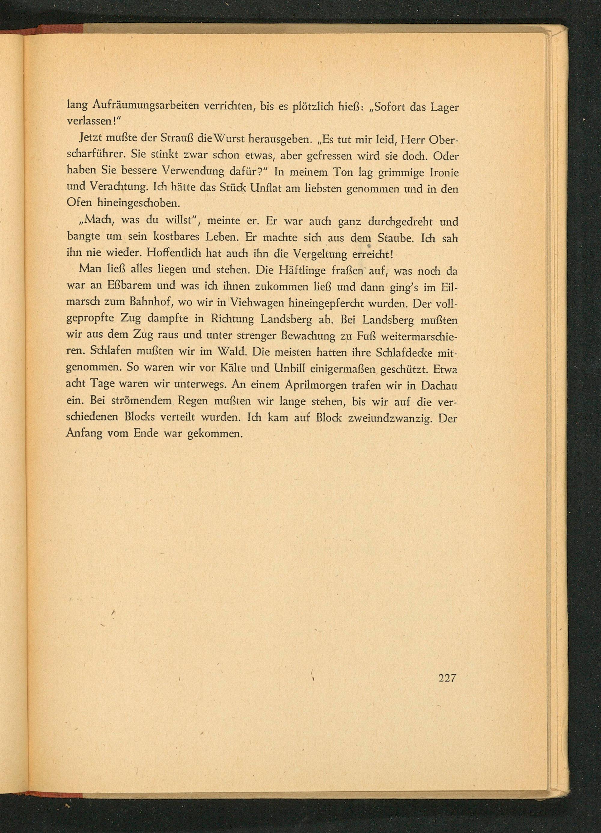 Man ließ alles liegen und stehen. Die Häftlinge fraßen auf, was noch da war an Eẞbarem und was ich ihnen zukommen ließ und dann ging's im Eilmarsch zum Bahnhof, wo wir in Viehwagen hineingepfercht wurden. Der vollgepropfte Zug dampfte in Richtung Landsberg ab. Bei Landsberg mußten wir aus dem Zug raus und unter strenger Bewachung zu Fuß weitermarschieren. Schlafen mußten wir im Wald. Die meisten hatten ihre Schlafdecke mitgenommen. So waren wir vor Kälte und Unbill einigermaßen, geschützt. Etwa acht Tage waren wir unterwegs. An einem Aprilmorgen trafen wir in Dachau ein. Bei strömendem Regen mußten wir lange stehen, bis wir auf die verschiedenen Blocks verteilt wurden. Ich kam auf Block zweiundzwanzig. Der Anfang vom Ende war gekommen.